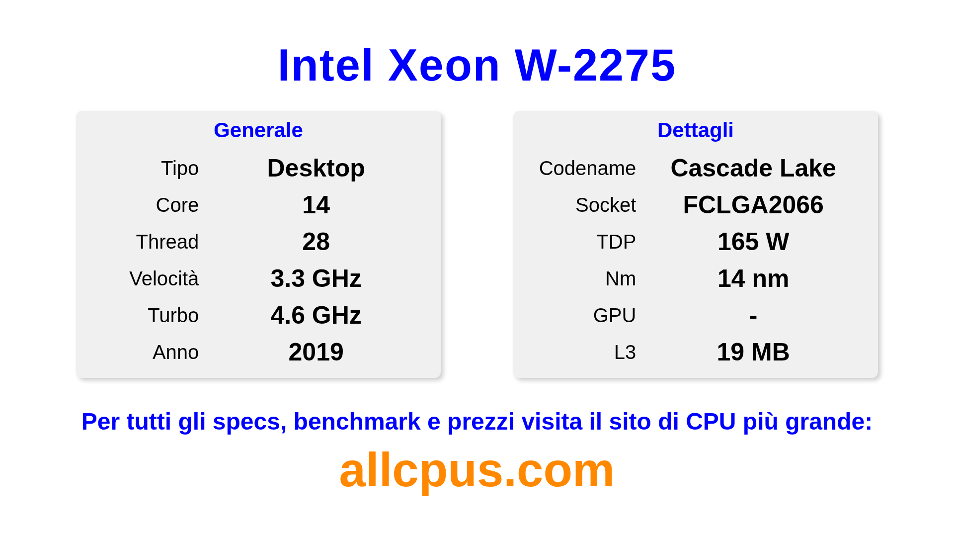 Il Intel Xeon W-2275 è un Intel processore desktop della linea Intel Xeon, costruito sull’architettura Cascade Lake e rilasciato nel 2019. Questa CPU ha 14 core, una frequenza base di 3300 MHz, frequenza turbo massima di 4600 MHz e 19 MB di cache L3. Prodotto usando tecnologia di processo a 14 nm.Il Intel Xeon W-2275 è progettato per il socket LGA2066. È necessaria una scheda grafica dedicata.