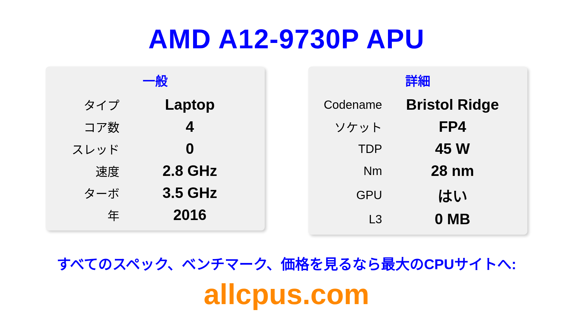 AMD A12-9730P APUはAMDのA-SeriesラインアップのノートPC用プロセッサで、Bristol Ridgeアーキテクチャを基に2016にリリースされました。 このCPUは4コア、基本クロック2800 MHz、最大ターボ周波数3500 MHz、0 MBのL3キャッシュを搭載しています。 28 nmプロセス技術で製造されています。AMD A12-9730P APUはFP4ソケット向けに設計されています。 統合AMD Radeon R7 Graphicsグラフィックスを搭載しています。