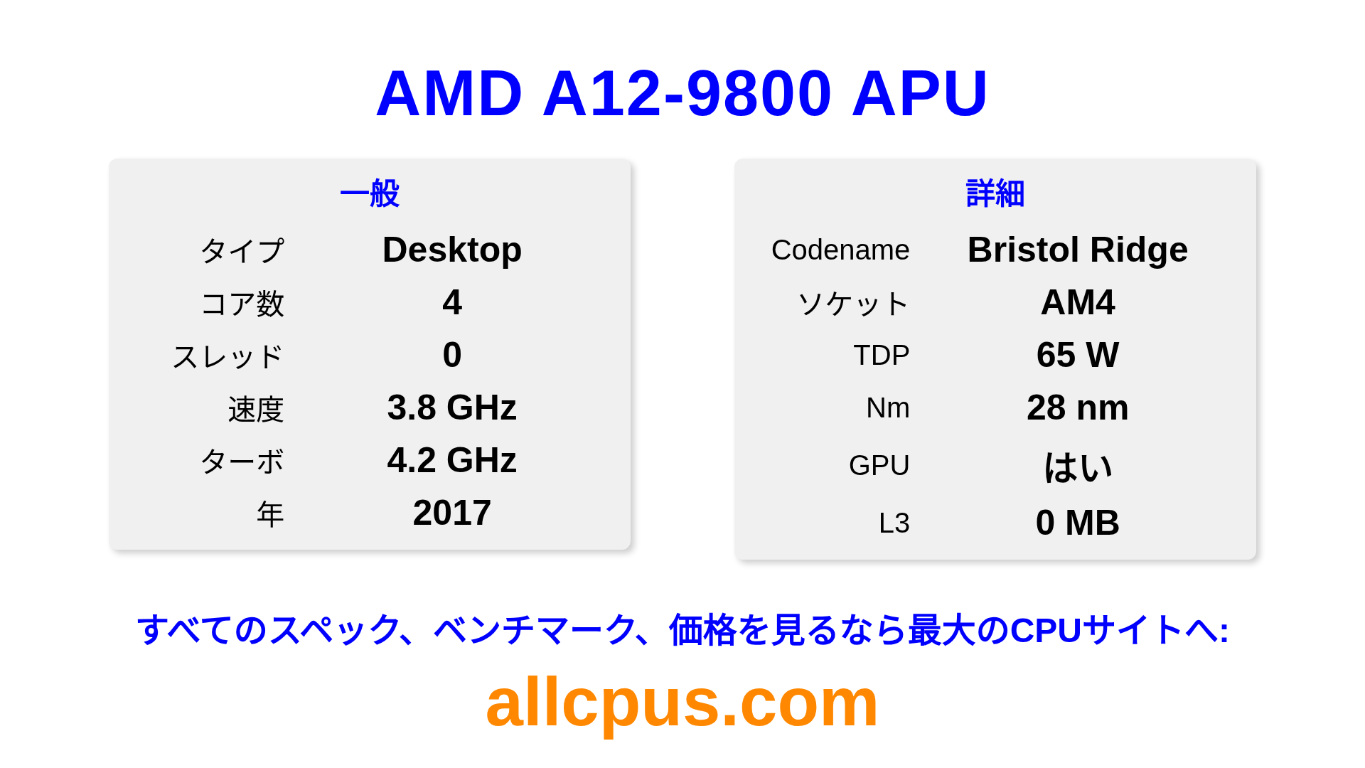 AMD A12-9800 APUはAMDのA-Seriesラインアップのデスクトップ用プロセッサで、Bristol Ridgeアーキテクチャを基に2017にリリースされました。 このCPUは4コア、基本クロック3800 MHz、最大ターボ周波数4200 MHz、0 MBのL3キャッシュを搭載しています。 28 nmプロセス技術で製造されています。AMD A12-9800 APUはAM4ソケット向けに設計されています。オーバークロックに対応しています。 統合Radeon R7 Seriesグラフィックスを搭載しています。
