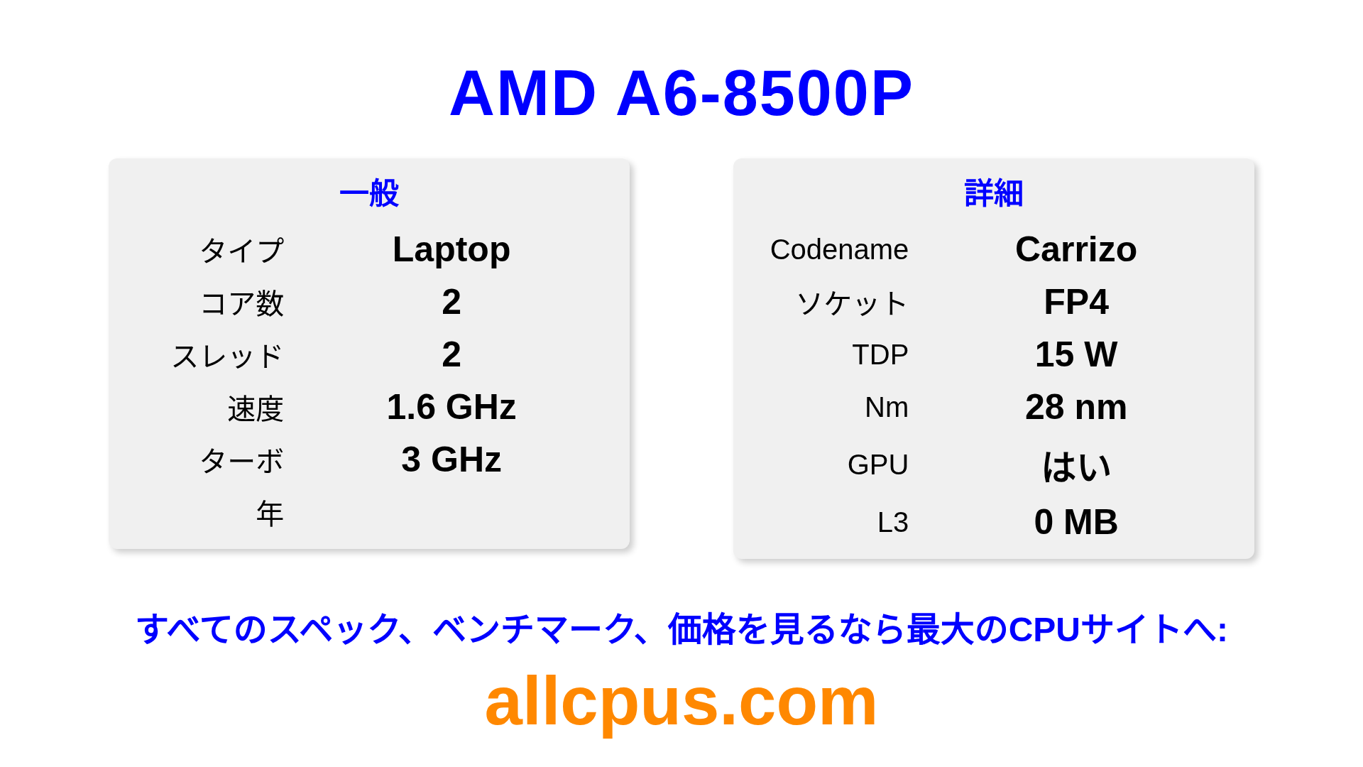 AMD A6-8500PはAMDのA-SeriesラインアップのノートPC用プロセッサで、Carrizoアーキテクチャを基ににリリースされました。 このCPUは2コア、基本クロック1600 MHz、最大ターボ周波数3000 MHz、0 MBのL3キャッシュを搭載しています。 28 nmプロセス技術で製造されています。AMD A6-8500PはFP4ソケット向けに設計されています。 統合AMD Radeon R5 Graphicsグラフィックスを搭載しています。