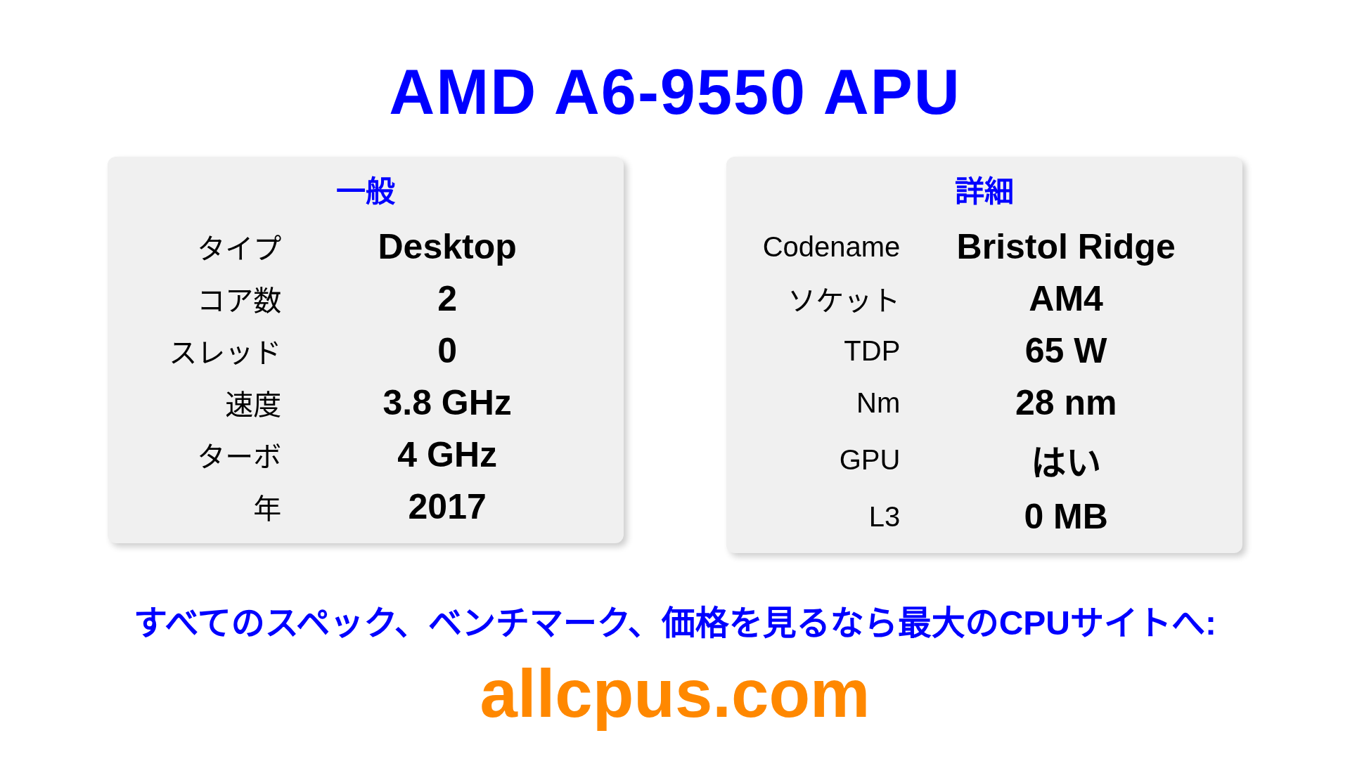 AMD A6-9550 APUはAMDのA-Seriesラインアップのデスクトップ用プロセッサで、Bristol Ridgeアーキテクチャを基に2017にリリースされました。 このCPUは2コア、基本クロック3800 MHz、最大ターボ周波数4000 MHz、0 MBのL3キャッシュを搭載しています。 28 nmプロセス技術で製造されています。AMD A6-9550 APUはAM4ソケット向けに設計されています。オーバークロックに対応しています。 統合Radeon R5 Seriesグラフィックスを搭載しています。