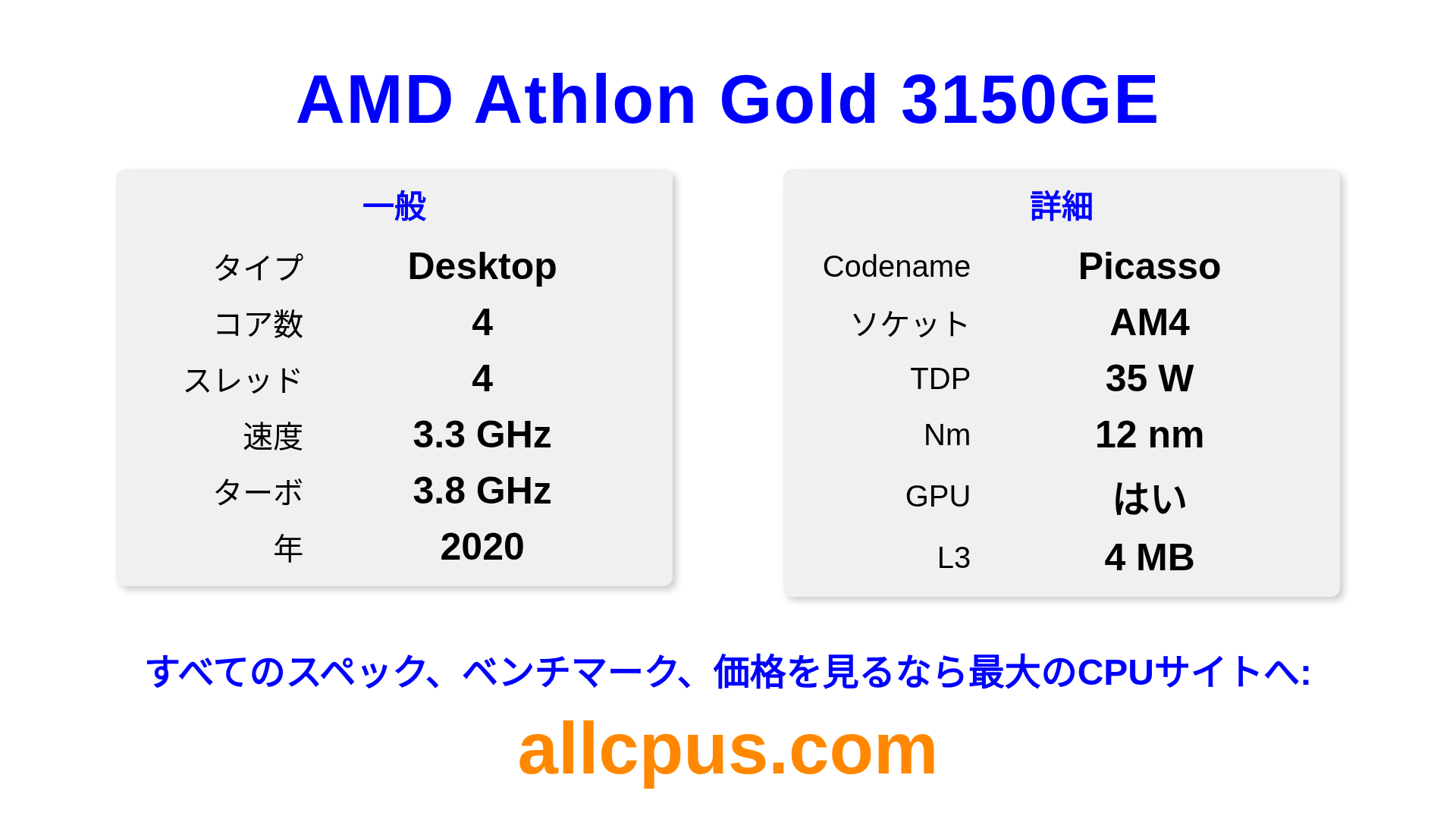 AMD Athlon Gold 3150GEはAMDのAthlonラインアップのデスクトップ用プロセッサで、Picassoアーキテクチャを基に2020にリリースされました。 このCPUは4コア、基本クロック3300 MHz、最大ターボ周波数3800 MHz、4 MBのL3キャッシュを搭載しています。 12 nmプロセス技術で製造されています。AMD Athlon Gold 3150GEはAM4ソケット向けに設計されています。オーバークロックに対応しています。 統合Radeon Graphicsグラフィックスを搭載しています。