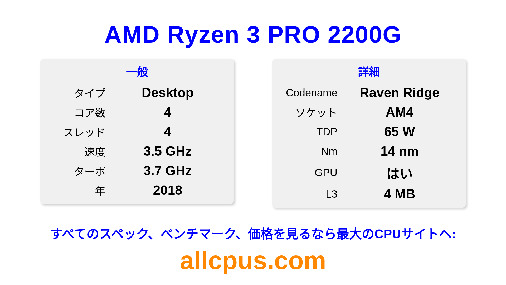 AMD Ryzen 3 PRO 2200GはAMDのRyzen PROラインアップのデスクトップ用プロセッサで、Raven Ridgeアーキテクチャを基に2018にリリースされました。 このCPUは4コア、基本クロック3500 MHz、最大ターボ周波数3700 MHz、4 MBのL3キャッシュを搭載しています。 14 nmプロセス技術で製造されています。AMD Ryzen 3 PRO 2200GはAM4ソケット向けに設計されています。 統合Radeon Vega 8 Graphicsグラフィックスを搭載しています。