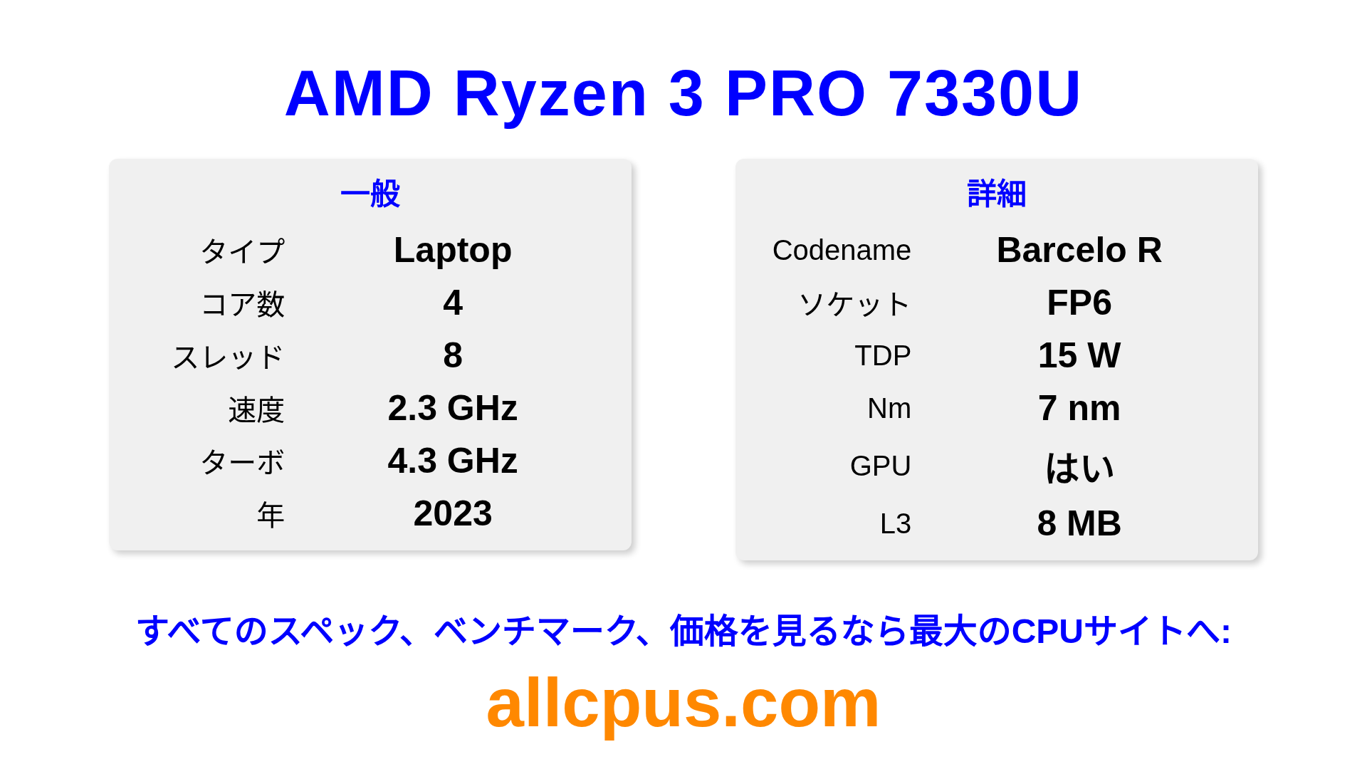 AMD Ryzen 3 PRO 7330UはAMDのRyzen PROラインアップのノートPC用プロセッサで、Barcelo Rアーキテクチャを基に2023にリリースされました。 このCPUは4コア、基本クロック2300 MHz、最大ターボ周波数4300 MHz、8 MBのL3キャッシュを搭載しています。 7 nmプロセス技術で製造されています。AMD Ryzen 3 PRO 7330UはFP6ソケット向けに設計されています。 統合AMD Radeon Graphicsグラフィックスを搭載しています。