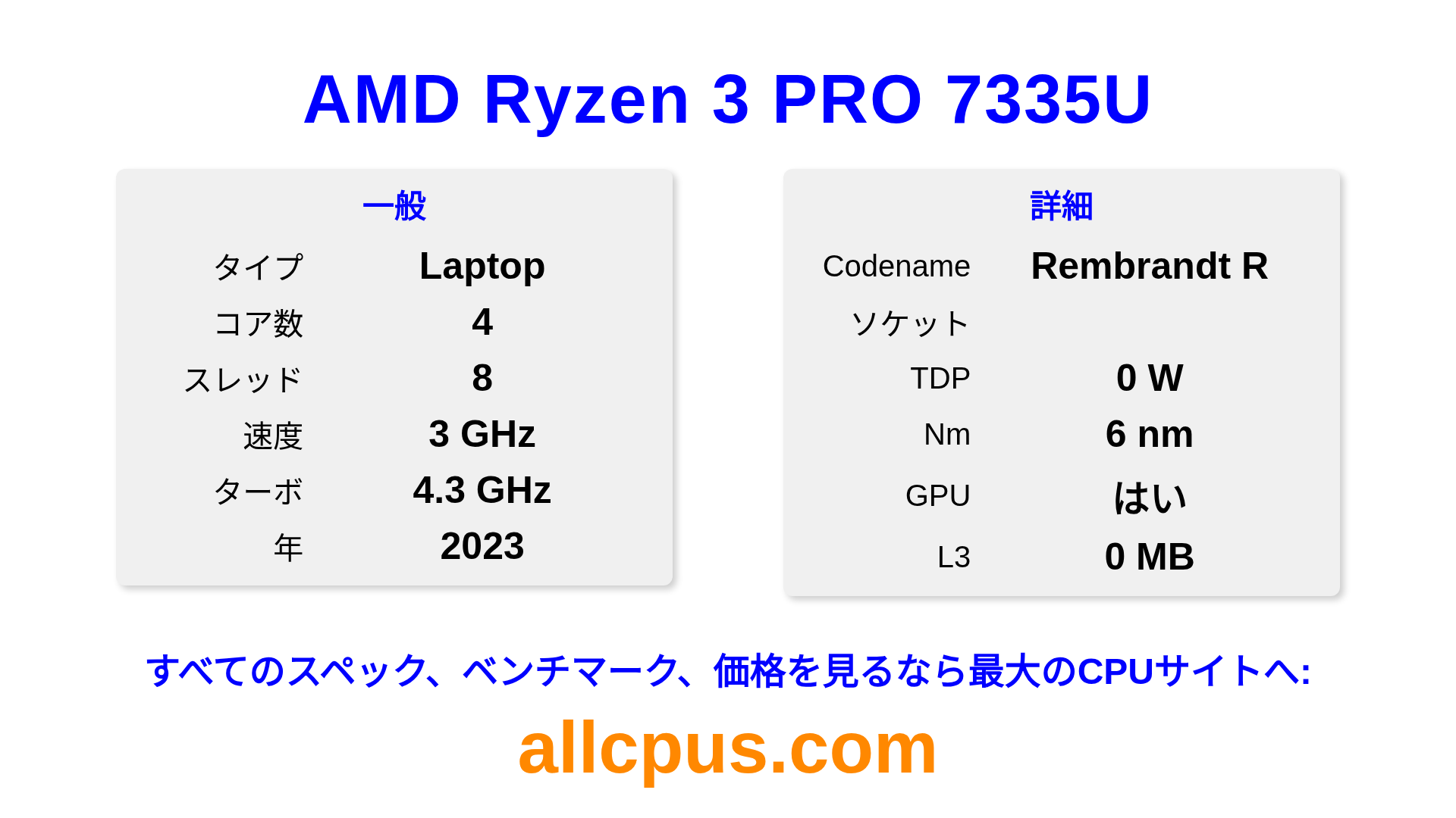 AMD Ryzen 3 PRO 7335UはAMDのRyzen PROラインアップのノートPC用プロセッサで、Rembrandt Rアーキテクチャを基に2023にリリースされました。 このCPUは4コア、基本クロック3000 MHz、最大ターボ周波数4300 MHz、0 MBのL3キャッシュを搭載しています。 6 nmプロセス技術で製造されています。AMD Ryzen 3 PRO 7335Uはソケット向けに設計されています。 統合AMD Radeon 660Mグラフィックスを搭載しています。