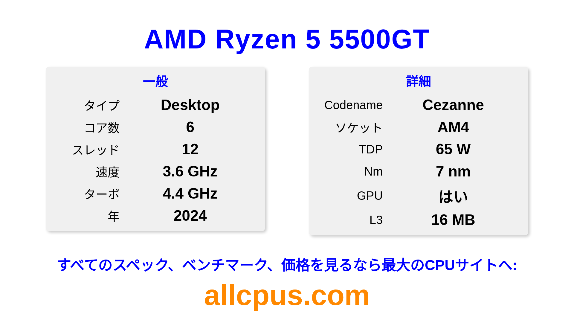 AMD Ryzen 5 5500GTはAMDのRyzenラインアップのデスクトップ用プロセッサで、Cezanneアーキテクチャを基に2024にリリースされました。 このCPUは6コア、基本クロック3600 MHz、最大ターボ周波数4400 MHz、16 MBのL3キャッシュを搭載しています。 7 nmプロセス技術で製造されています。AMD Ryzen 5 5500GTはAM4ソケット向けに設計されています。オーバークロックに対応しています。 統合Radeon Graphicsグラフィックスを搭載しています。