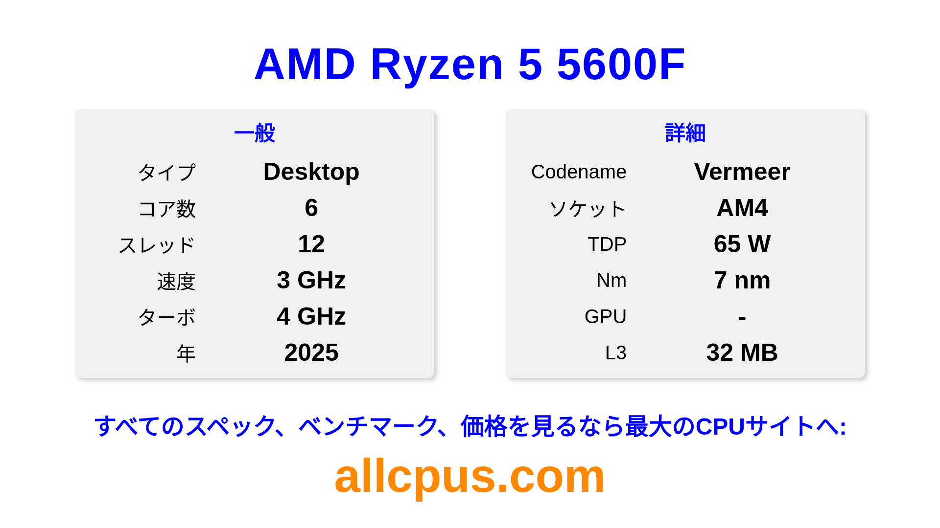 AMD Ryzen 5 5600FはAMDのRyzenラインアップのデスクトップ用プロセッサで、Vermeerアーキテクチャを基に2025にリリースされました。 このCPUは6コア、基本クロック3000 MHz、最大ターボ周波数4000 MHz、32 MBのL3キャッシュを搭載しています。 7 nmプロセス技術で製造されています。AMD Ryzen 5 5600FはAM4ソケット向けに設計されています。オーバークロックに対応しています。 専用グラフィックカードが必要です。