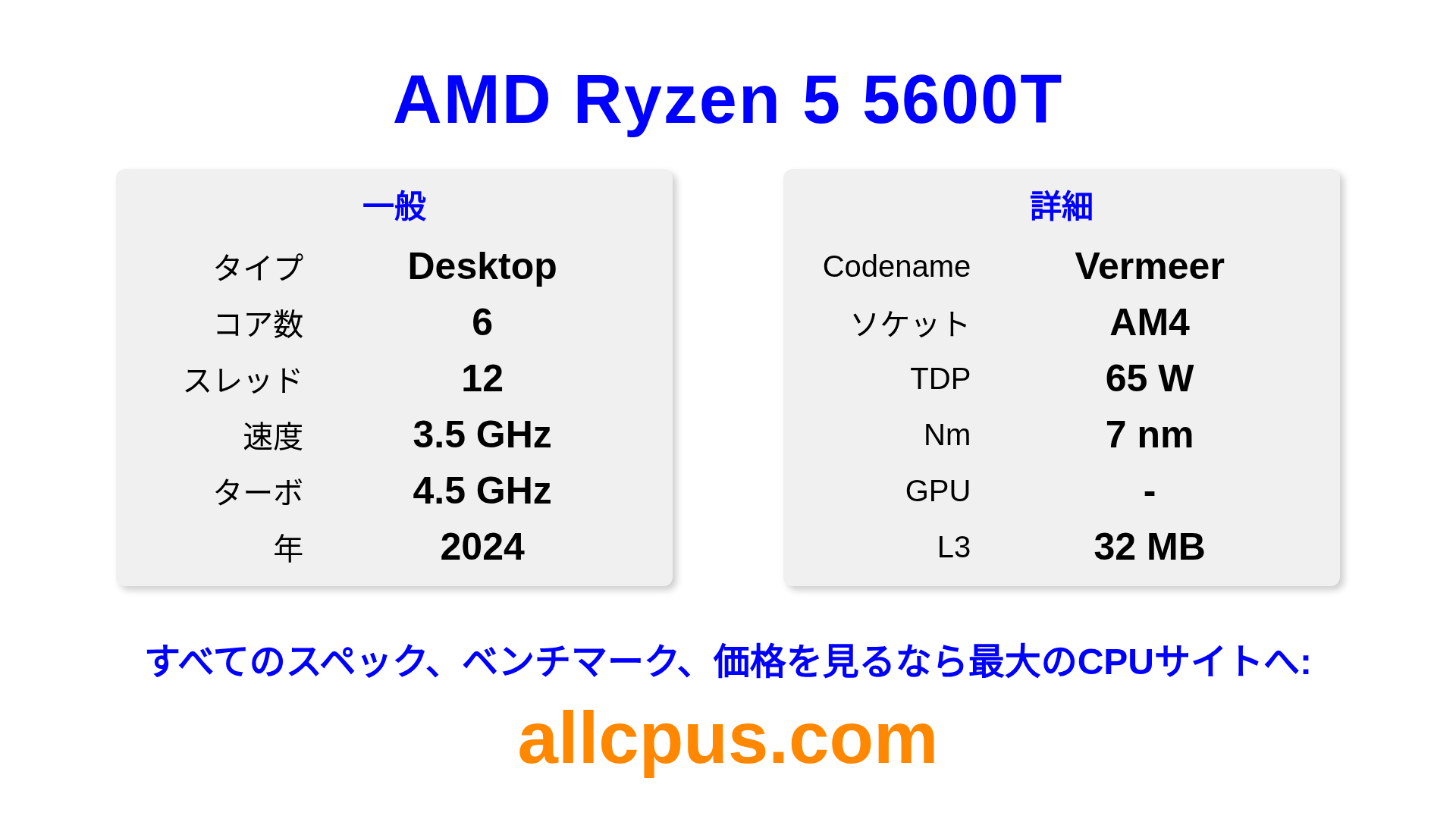 AMD Ryzen 5 5600TはAMDのRyzenラインアップのデスクトップ用プロセッサで、Vermeerアーキテクチャを基に2024にリリースされました。 このCPUは6コア、基本クロック3500 MHz、最大ターボ周波数4500 MHz、32 MBのL3キャッシュを搭載しています。 7 nmプロセス技術で製造されています。AMD Ryzen 5 5600TはAM4ソケット向けに設計されています。オーバークロックに対応しています。 専用グラフィックカードが必要です。