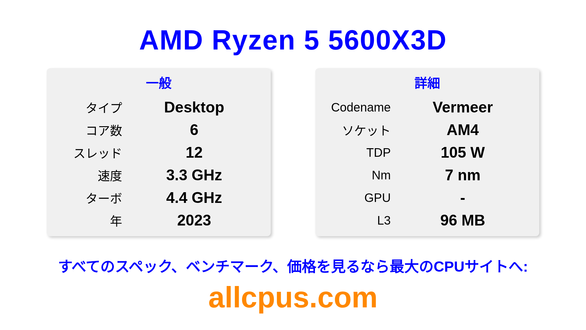 AMD Ryzen 5 5600X3DはAMDのRyzenラインアップのデスクトップ用プロセッサで、Vermeerアーキテクチャを基に2023にリリースされました。 このCPUは6コア、基本クロック3300 MHz、最大ターボ周波数4400 MHz、96 MBのL3キャッシュを搭載しています。 7 nmプロセス技術で製造されています。AMD Ryzen 5 5600X3DはAM4ソケット向けに設計されています。オーバークロックに対応しています。 専用グラフィックカードが必要です。