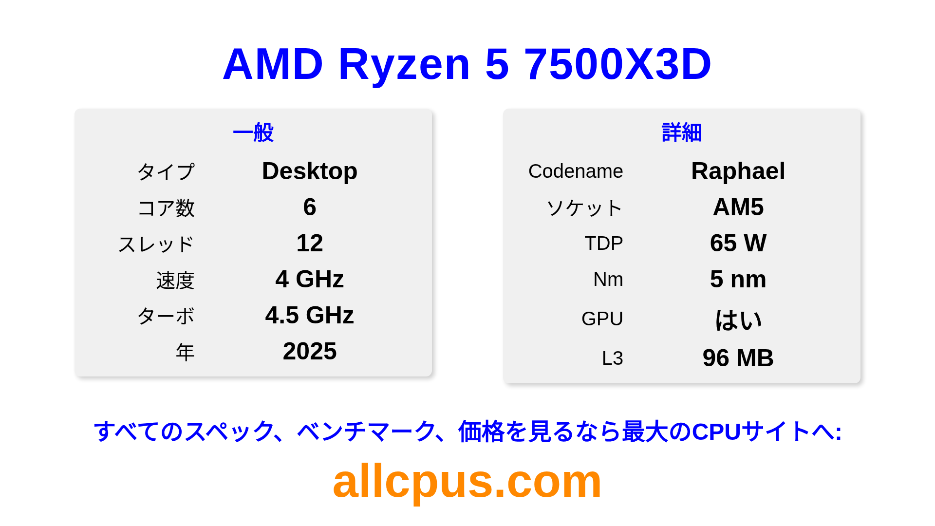 AMD Ryzen 5 7500X3DはAMDのRyzenラインアップのデスクトップ用プロセッサで、Raphaelアーキテクチャを基に2025にリリースされました。 このCPUは6コア、基本クロック4000 MHz、最大ターボ周波数4500 MHz、96 MBのL3キャッシュを搭載しています。 5 nmプロセス技術で製造されています。AMD Ryzen 5 7500X3DはAM5ソケット向けに設計されています。オーバークロックに対応しています。 統合AMD Radeon Graphicsグラフィックスを搭載しています。