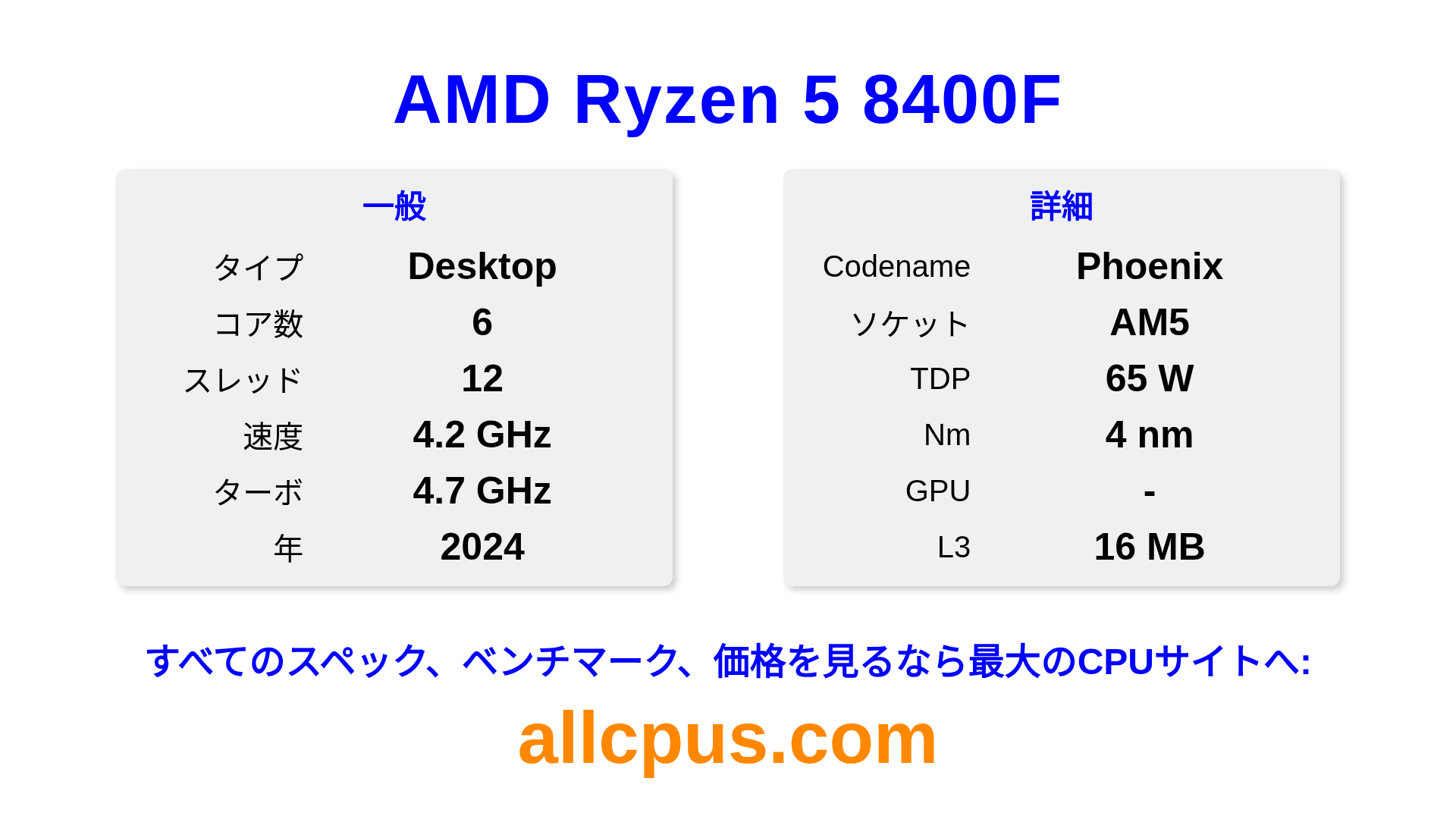 AMD Ryzen 5 8400FはAMDのRyzenラインアップのデスクトップ用プロセッサで、Phoenixアーキテクチャを基に2024にリリースされました。 このCPUは6コア、基本クロック4200 MHz、最大ターボ周波数4700 MHz、16 MBのL3キャッシュを搭載しています。 4 nmプロセス技術で製造されています。AMD Ryzen 5 8400FはAM5ソケット向けに設計されています。オーバークロックに対応しています。 専用グラフィックカードが必要です。