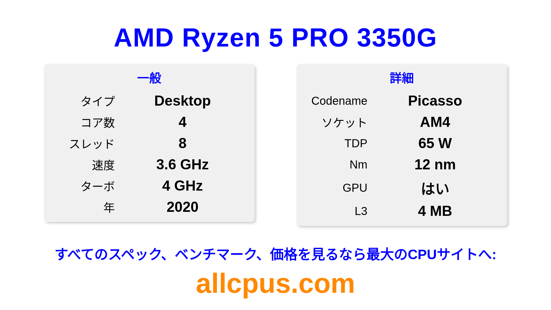 AMD Ryzen 5 PRO 3350GはAMDのRyzen PROラインアップのデスクトップ用プロセッサで、Picassoアーキテクチャを基に2020にリリースされました。 このCPUは4コア、基本クロック3600 MHz、最大ターボ周波数4000 MHz、4 MBのL3キャッシュを搭載しています。 12 nmプロセス技術で製造されています。AMD Ryzen 5 PRO 3350GはAM4ソケット向けに設計されています。 統合Radeon Graphicsグラフィックスを搭載しています。
