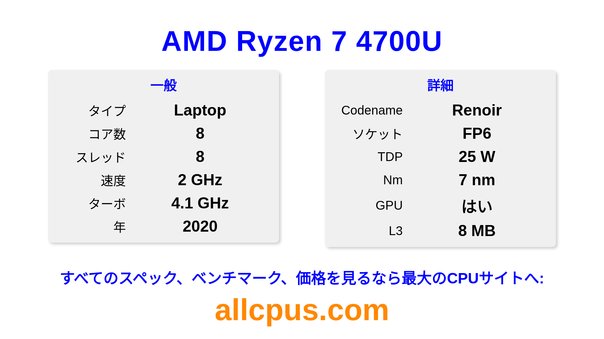AMD Ryzen 7 4700UはAMDのRyzenラインアップのノートPC用プロセッサで、Renoirアーキテクチャを基に2020にリリースされました。 このCPUは8コア、基本クロック2000 MHz、最大ターボ周波数4100 MHz、8 MBのL3キャッシュを搭載しています。 7 nmプロセス技術で製造されています。AMD Ryzen 7 4700UはFP6ソケット向けに設計されています。オーバークロックに対応しています。 統合AMD Radeon Graphicsグラフィックスを搭載しています。