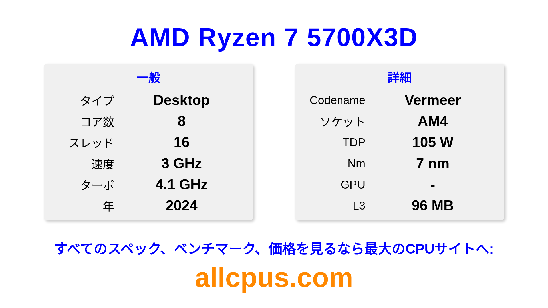 AMD Ryzen 7 5700X3DはAMDのRyzenラインアップのデスクトップ用プロセッサで、Vermeerアーキテクチャを基に2024にリリースされました。 このCPUは8コア、基本クロック3000 MHz、最大ターボ周波数4100 MHz、96 MBのL3キャッシュを搭載しています。 7 nmプロセス技術で製造されています。AMD Ryzen 7 5700X3DはAM4ソケット向けに設計されています。オーバークロックに対応しています。 専用グラフィックカードが必要です。