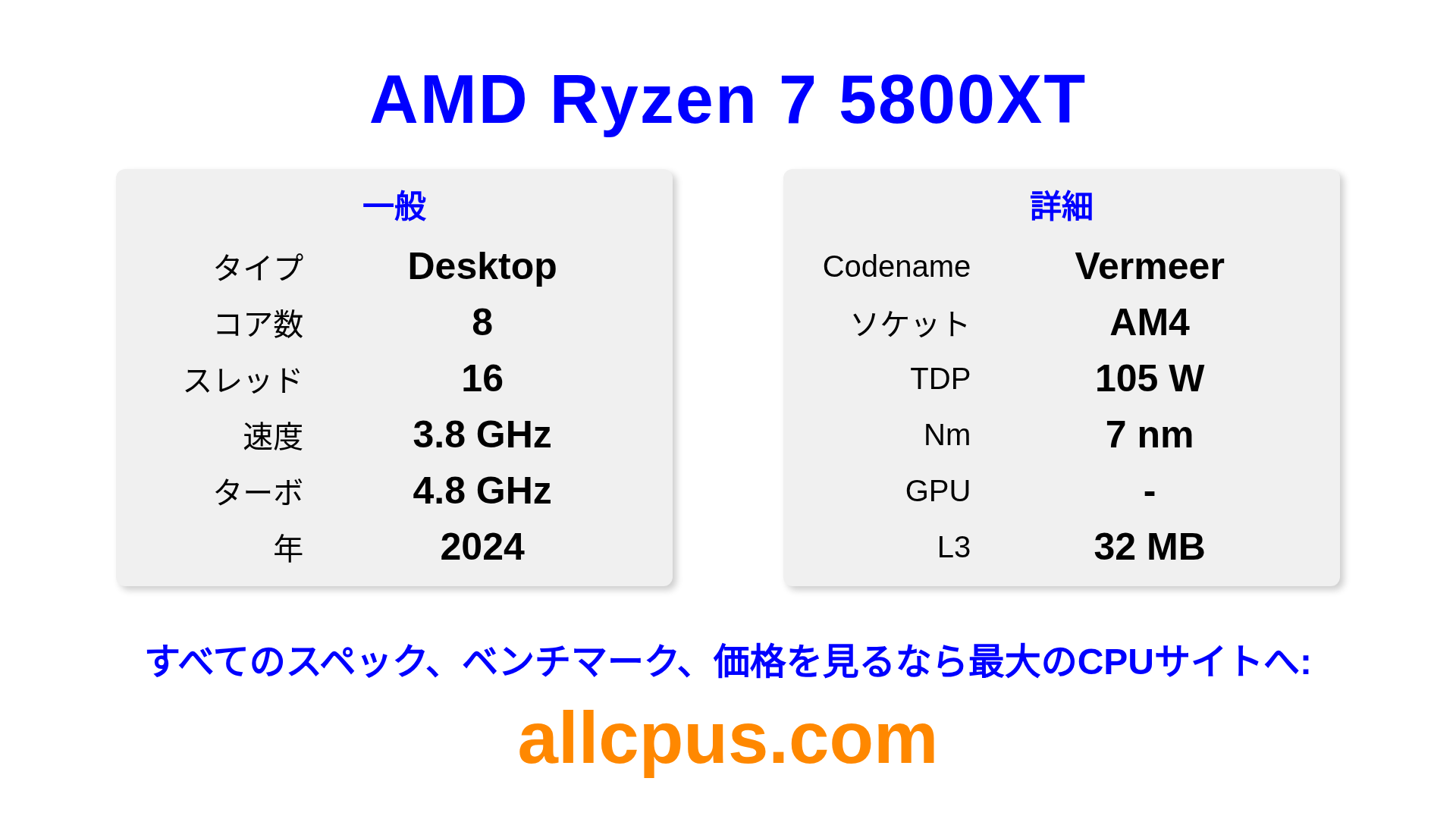 AMD Ryzen 7 5800XTはAMDのRyzenラインアップのデスクトップ用プロセッサで、Vermeerアーキテクチャを基に2024にリリースされました。 このCPUは8コア、基本クロック3800 MHz、最大ターボ周波数4800 MHz、32 MBのL3キャッシュを搭載しています。 7 nmプロセス技術で製造されています。AMD Ryzen 7 5800XTはAM4ソケット向けに設計されています。オーバークロックに対応しています。 専用グラフィックカードが必要です。