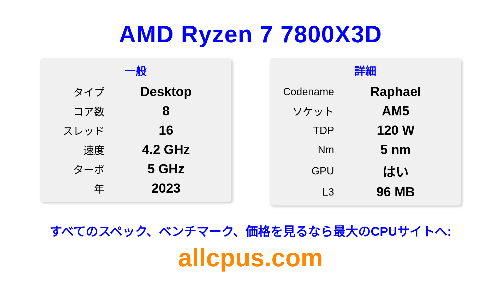 AMD Ryzen 7 7800X3DはAMDのRyzenラインアップのデスクトップ用プロセッサで、Raphaelアーキテクチャを基に2023にリリースされました。 このCPUは8コア、基本クロック4200 MHz、最大ターボ周波数5000 MHz、96 MBのL3キャッシュを搭載しています。 5 nmプロセス技術で製造されています。AMD Ryzen 7 7800X3DはAM5ソケット向けに設計されています。オーバークロックに対応しています。 統合AMD Radeon Graphicsグラフィックスを搭載しています。