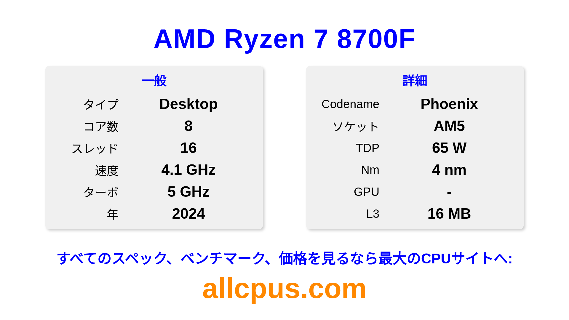 AMD Ryzen 7 8700FはAMDのRyzenラインアップのデスクトップ用プロセッサで、Phoenixアーキテクチャを基に2024にリリースされました。 このCPUは8コア、基本クロック4100 MHz、最大ターボ周波数5000 MHz、16 MBのL3キャッシュを搭載しています。 4 nmプロセス技術で製造されています。AMD Ryzen 7 8700FはAM5ソケット向けに設計されています。オーバークロックに対応しています。 専用グラフィックカードが必要です。