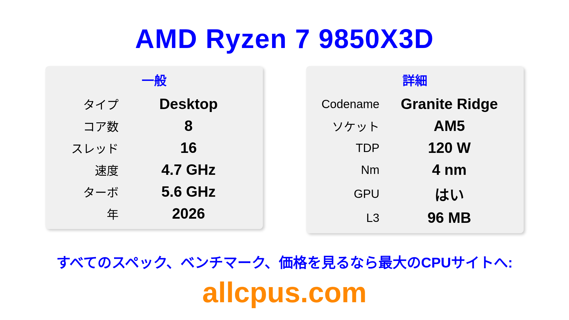 AMD Ryzen 7 9850X3DはAMDのRyzenラインアップのデスクトップ用プロセッサで、Granite Ridgeアーキテクチャを基に2026にリリースされました。 このCPUは8コア、基本クロック4700 MHz、最大ターボ周波数5600 MHz、96 MBのL3キャッシュを搭載しています。 4 nmプロセス技術で製造されています。AMD Ryzen 7 9850X3DはAM5ソケット向けに設計されています。オーバークロックに対応しています。 統合AMD Radeon Graphicsグラフィックスを搭載しています。