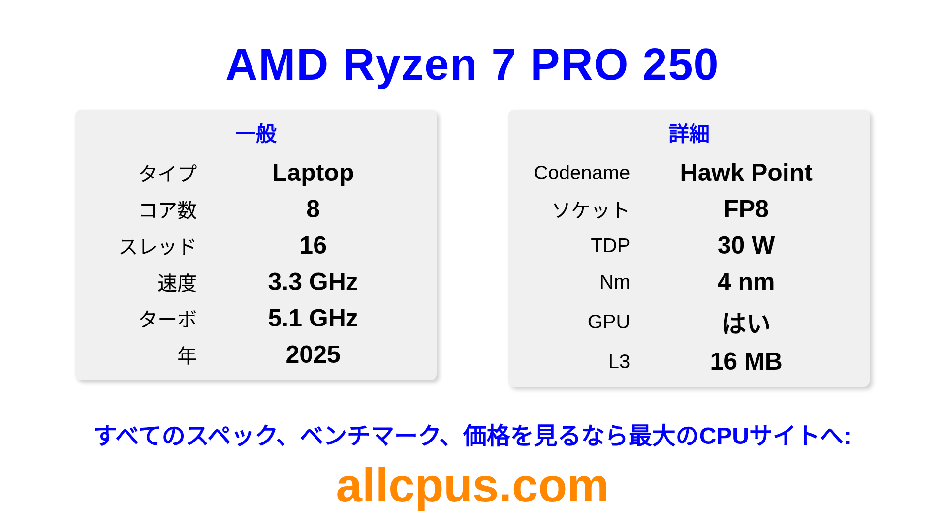 AMD Ryzen 7 PRO 250はAMDのRyzen PROラインアップのノートPC用プロセッサで、Hawk Pointアーキテクチャを基に2025にリリースされました。 このCPUは8コア、基本クロック3300 MHz、最大ターボ周波数5100 MHz、16 MBのL3キャッシュを搭載しています。 4 nmプロセス技術で製造されています。AMD Ryzen 7 PRO 250はFP8ソケット向けに設計されています。 統合AMD Radeon 780Mグラフィックスを搭載しています。