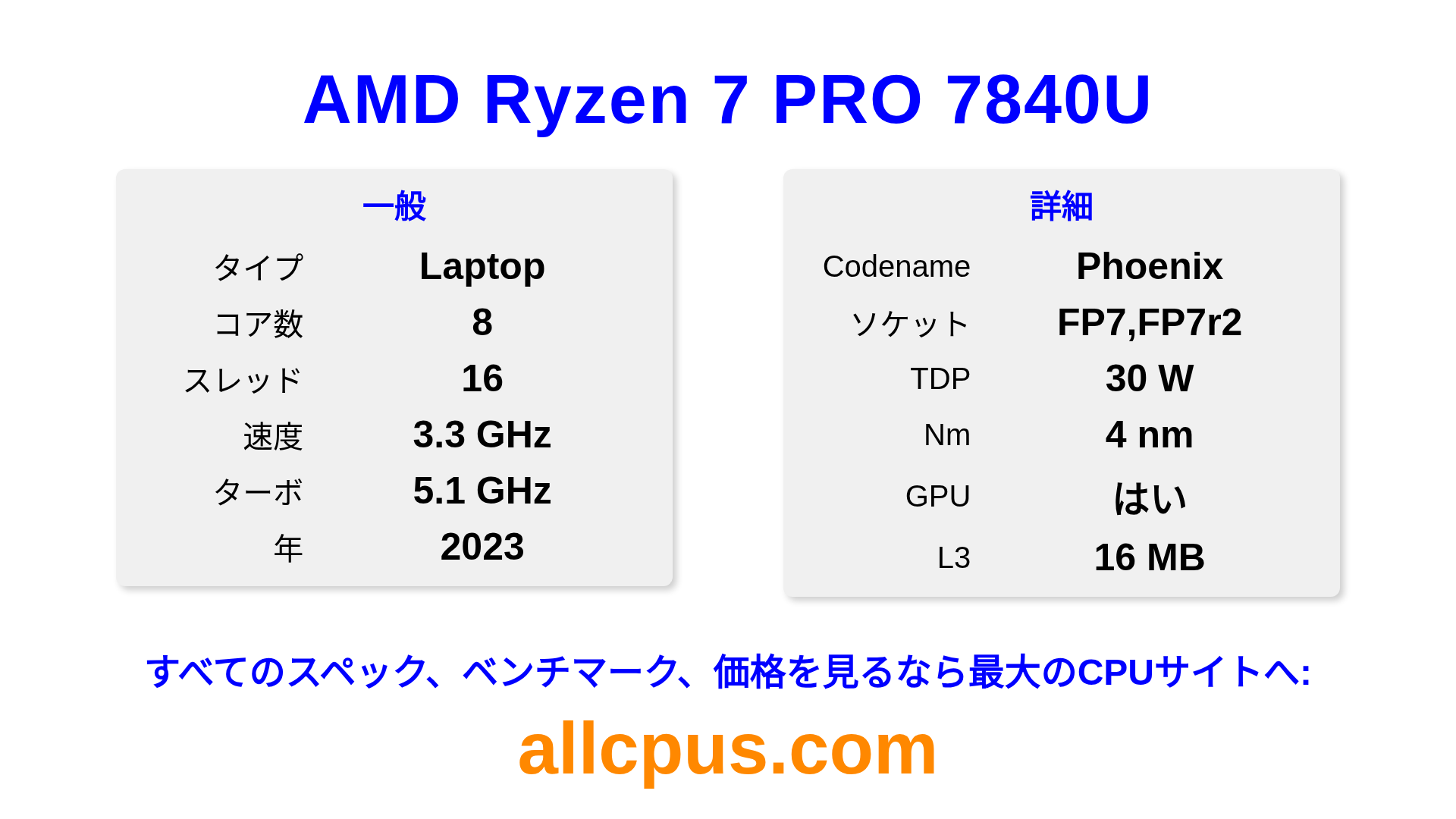 AMD Ryzen 7 PRO 7840UはAMDのRyzen PROラインアップのノートPC用プロセッサで、Phoenixアーキテクチャを基に2023にリリースされました。 このCPUは8コア、基本クロック3300 MHz、最大ターボ周波数5100 MHz、16 MBのL3キャッシュを搭載しています。 4 nmプロセス技術で製造されています。AMD Ryzen 7 PRO 7840UはFP7,FP7r2ソケット向けに設計されています。 統合AMD Radeon 780Mグラフィックスを搭載しています。