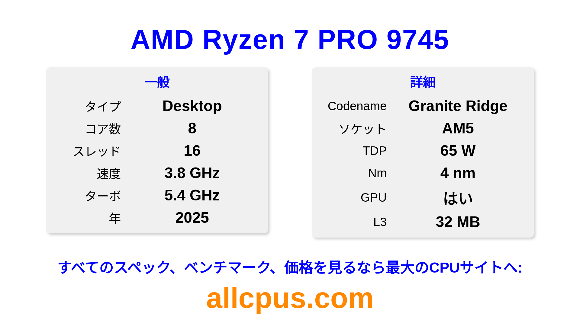 AMD Ryzen 7 PRO 9745はAMDのRyzen PROラインアップのデスクトップ用プロセッサで、Granite Ridgeアーキテクチャを基に2025にリリースされました。 このCPUは8コア、基本クロック3800 MHz、最大ターボ周波数5400 MHz、32 MBのL3キャッシュを搭載しています。 4 nmプロセス技術で製造されています。AMD Ryzen 7 PRO 9745はAM5ソケット向けに設計されています。 統合AMD Radeon Graphicsグラフィックスを搭載しています。