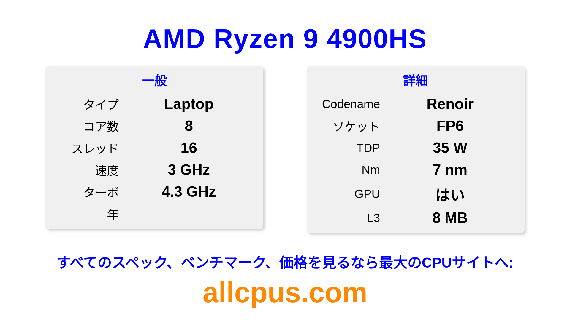 AMD Ryzen 9 4900HSはAMDのRyzenラインアップのノートPC用プロセッサで、Renoirアーキテクチャを基ににリリースされました。 このCPUは8コア、基本クロック3000 MHz、最大ターボ周波数4300 MHz、8 MBのL3キャッシュを搭載しています。 7 nmプロセス技術で製造されています。AMD Ryzen 9 4900HSはFP6ソケット向けに設計されています。 統合AMD Radeon Graphicsグラフィックスを搭載しています。