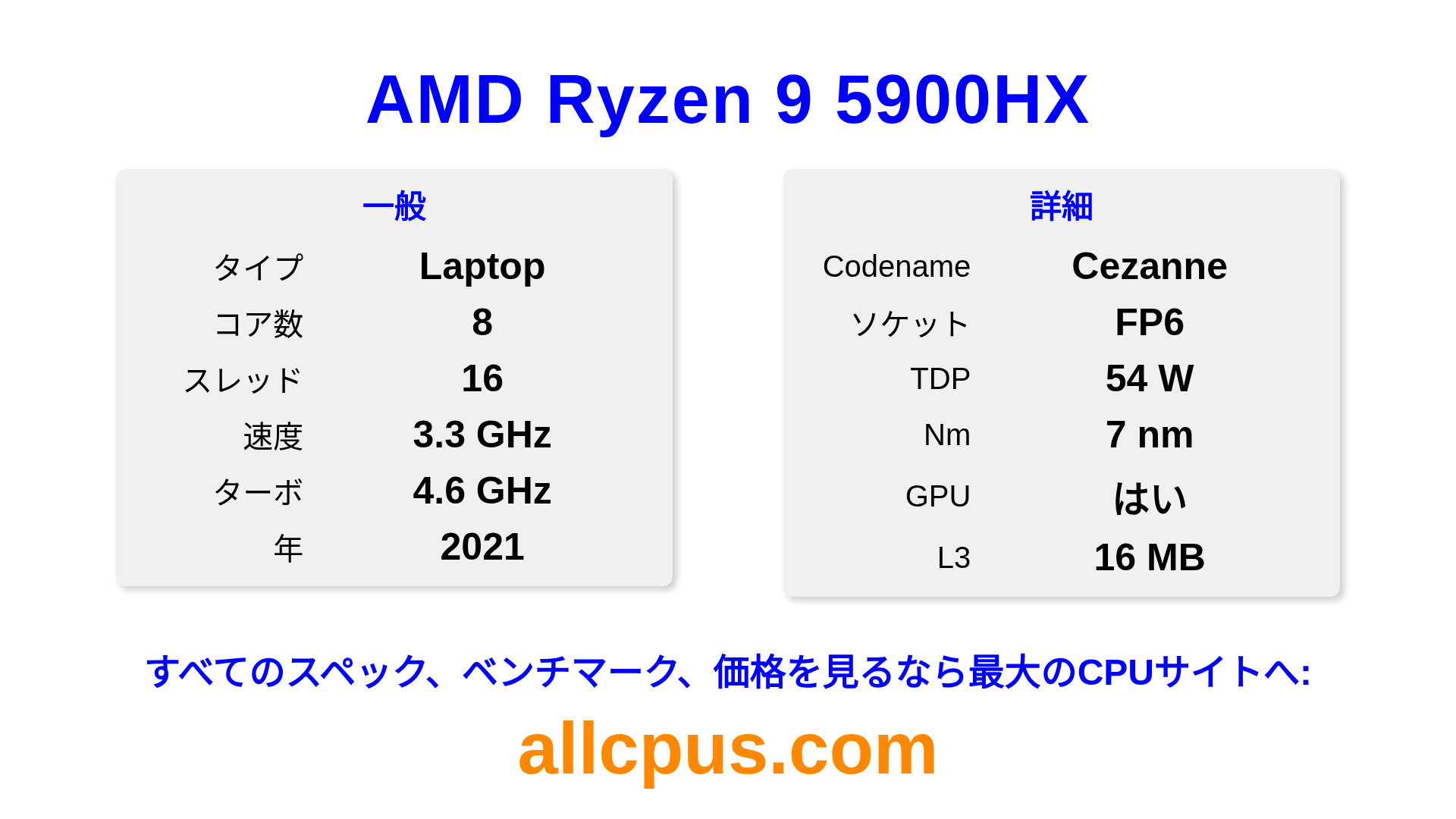 AMD Ryzen 9 5900HXはAMDのRyzenラインアップのノートPC用プロセッサで、Cezanneアーキテクチャを基に2021にリリースされました。 このCPUは8コア、基本クロック3300 MHz、最大ターボ周波数4600 MHz、16 MBのL3キャッシュを搭載しています。 7 nmプロセス技術で製造されています。AMD Ryzen 9 5900HXはFP6ソケット向けに設計されています。オーバークロックに対応しています。 統合AMD Radeon Graphicsグラフィックスを搭載しています。