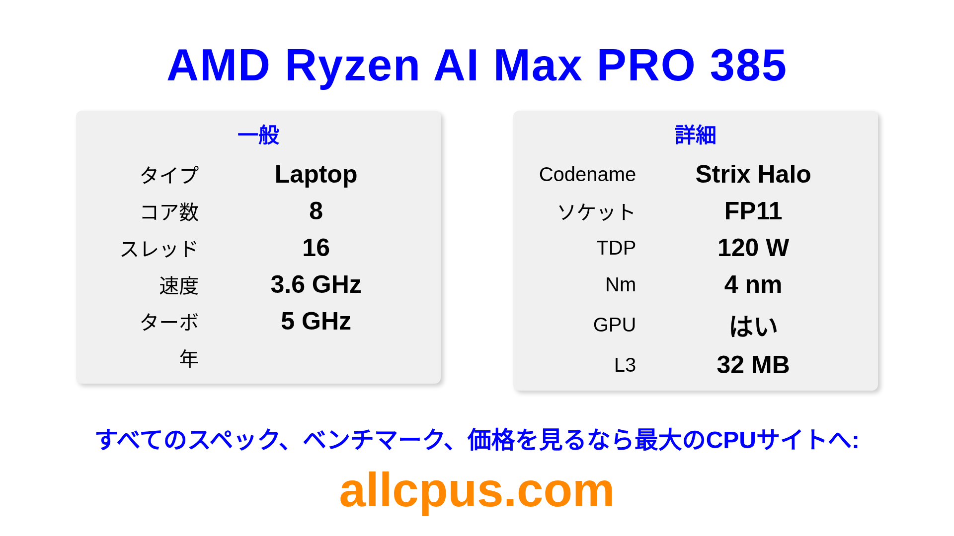 AMD Ryzen AI Max PRO 385はAMDのRyzen PROラインアップのノートPC用プロセッサで、Strix Haloアーキテクチャを基ににリリースされました。 このCPUは8コア、基本クロック3600 MHz、最大ターボ周波数5000 MHz、32 MBのL3キャッシュを搭載しています。 4 nmプロセス技術で製造されています。AMD Ryzen AI Max PRO 385はFP11ソケット向けに設計されています。オーバークロックに対応しています。 統合Radeon 8050S Graphicsグラフィックスを搭載しています。