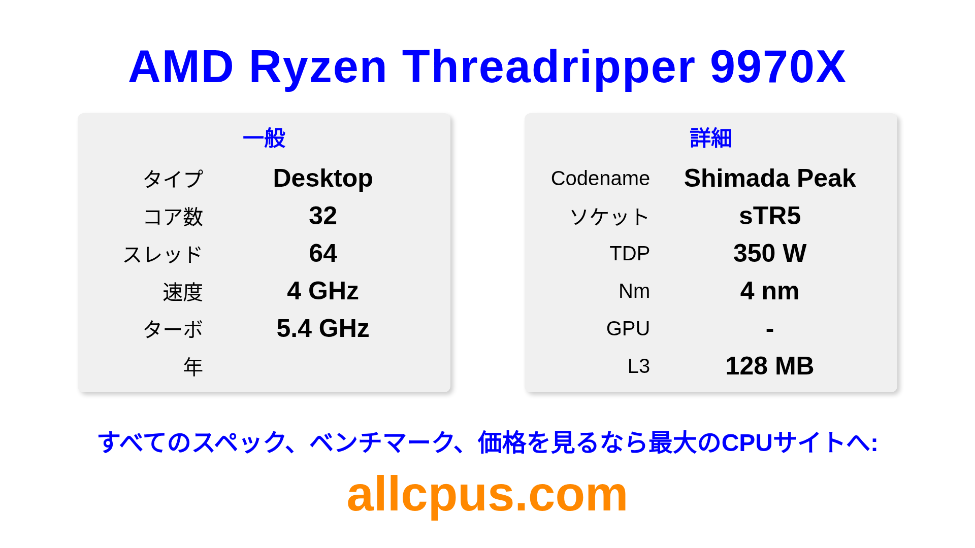 AMD Ryzen Threadripper 9970XはAMDのRyzen Threadripperラインアップのデスクトップ用プロセッサで、Shimada Peakアーキテクチャを基ににリリースされました。 このCPUは32コア、基本クロック4000 MHz、最大ターボ周波数5400 MHz、128 MBのL3キャッシュを搭載しています。 4 nmプロセス技術で製造されています。AMD Ryzen Threadripper 9970XはsTR5ソケット向けに設計されています。オーバークロックに対応しています。 専用グラフィックカードが必要です。