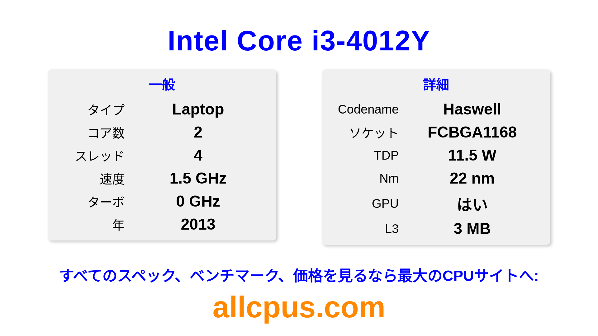 Intel Core i3-4012YはIntelのIntel CoreラインアップのノートPC用プロセッサで、Haswellアーキテクチャを基に2013にリリースされました。 このCPUは2コア、基本クロック1500 MHz、最大ターボ周波数0 MHz、3 MBのL3キャッシュを搭載しています。 22 nmプロセス技術で製造されています。Intel Core i3-4012YはBGA1168ソケット向けに設計されています。 統合Intel® HD Graphics 4200グラフィックスを搭載しています。