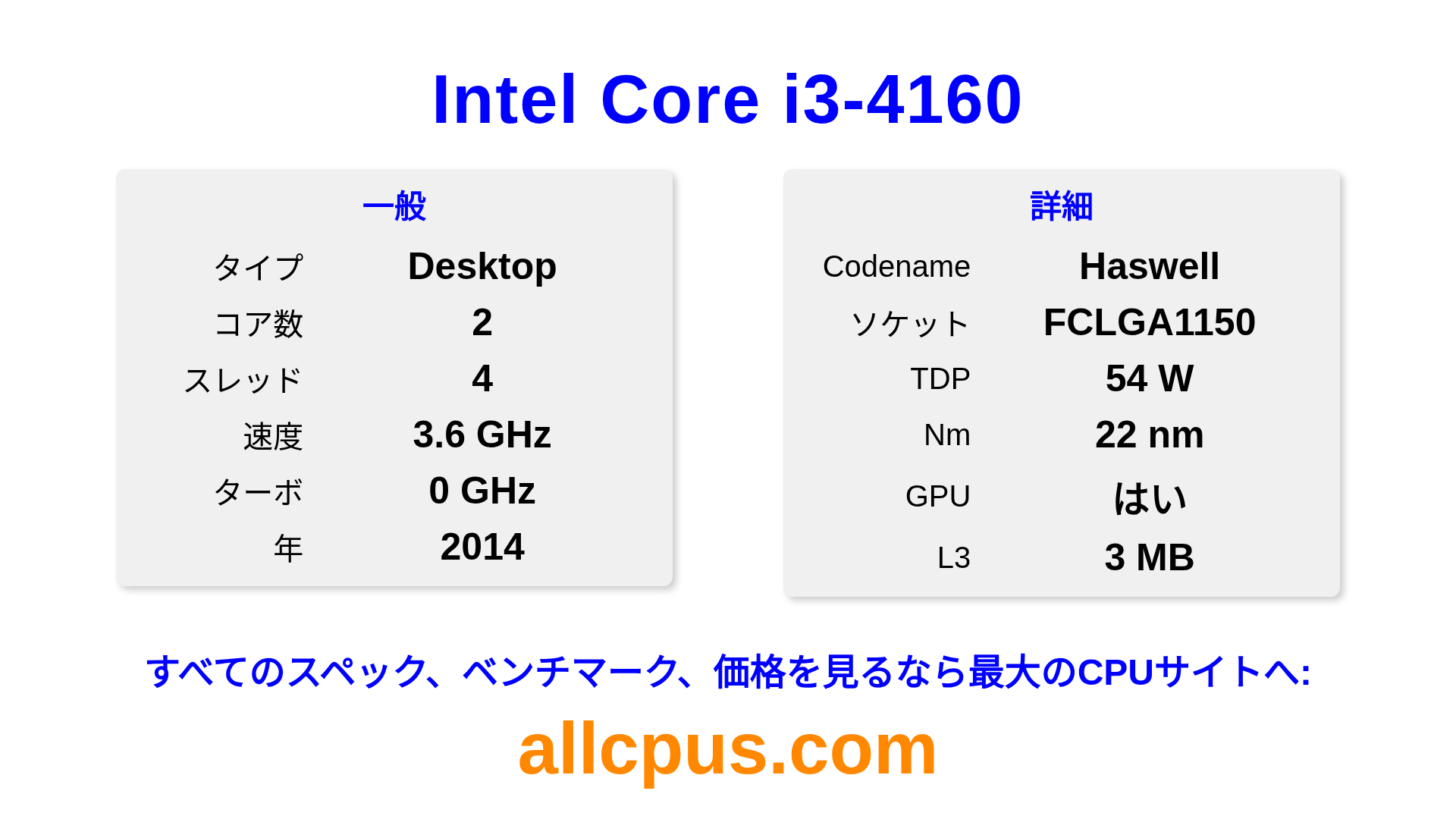 Intel Core i3-4160はIntelのIntel Coreラインアップのデスクトップ用プロセッサで、Haswellアーキテクチャを基に2014にリリースされました。 このCPUは2コア、基本クロック3600 MHz、最大ターボ周波数0 MHz、3 MBのL3キャッシュを搭載しています。 22 nmプロセス技術で製造されています。Intel Core i3-4160はLGA1150ソケット向けに設計されています。 統合Intel® HD Graphics 4400グラフィックスを搭載しています。