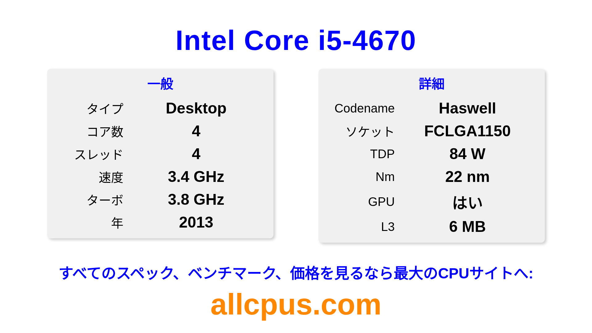 Intel Core i5-4670はIntelのIntel Coreラインアップのデスクトップ用プロセッサで、Haswellアーキテクチャを基に2013にリリースされました。 このCPUは4コア、基本クロック3400 MHz、最大ターボ周波数3800 MHz、6 MBのL3キャッシュを搭載しています。 22 nmプロセス技術で製造されています。Intel Core i5-4670はLGA1150ソケット向けに設計されています。 統合Intel® HD Graphics 4600グラフィックスを搭載しています。