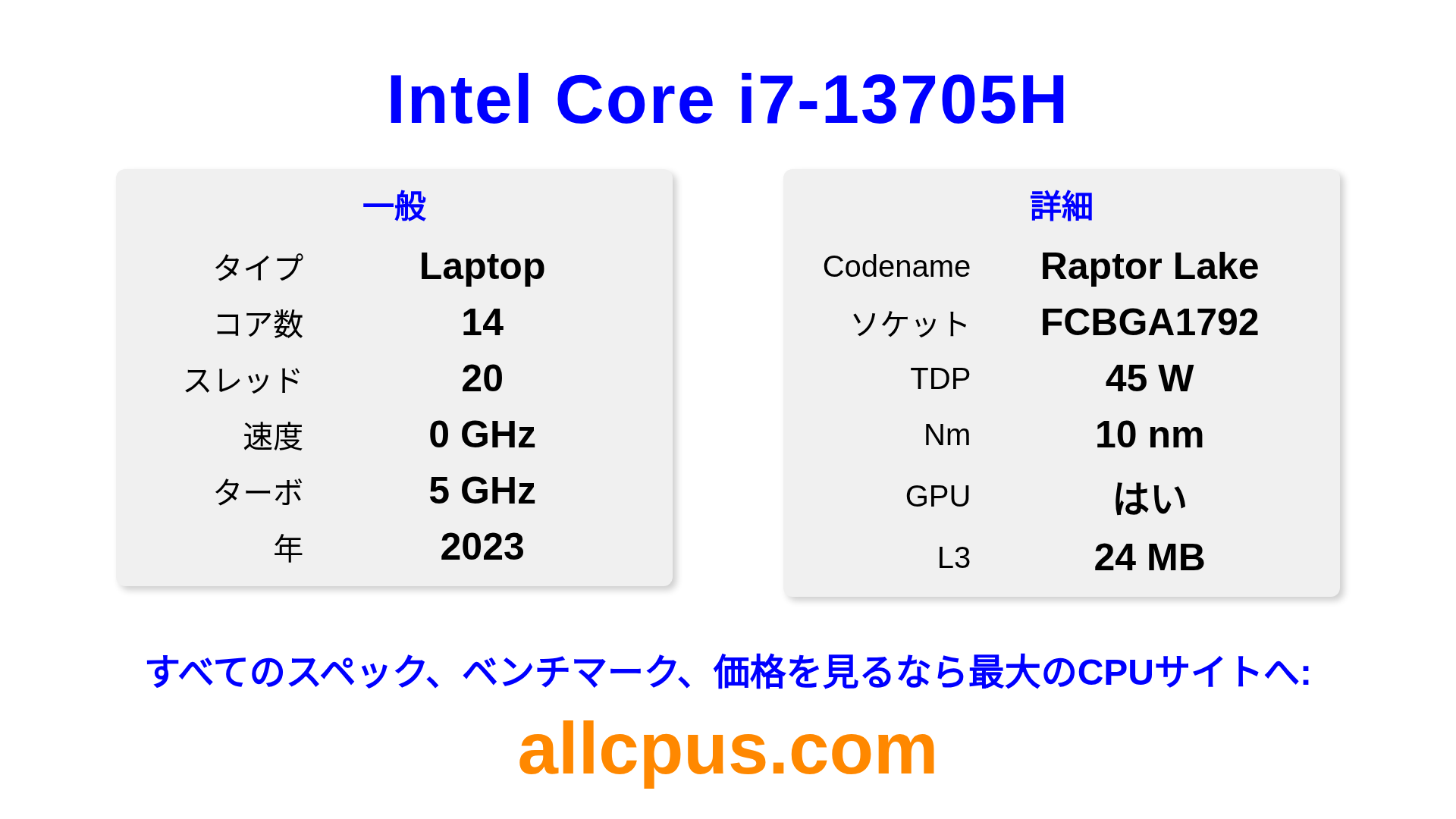 Intel Core i7-13705HはIntelのIntel CoreラインアップのノートPC用プロセッサで、Raptor Lakeアーキテクチャを基に2023にリリースされました。 このCPUは14コア、基本クロック0 MHz、最大ターボ周波数5000 MHz、24 MBのL3キャッシュを搭載しています。 10 nmプロセス技術で製造されています。Intel Core i7-13705HはBGA1792ソケット向けに設計されています。 統合Intel® Iris® Xe Graphics eligibleグラフィックスを搭載しています。