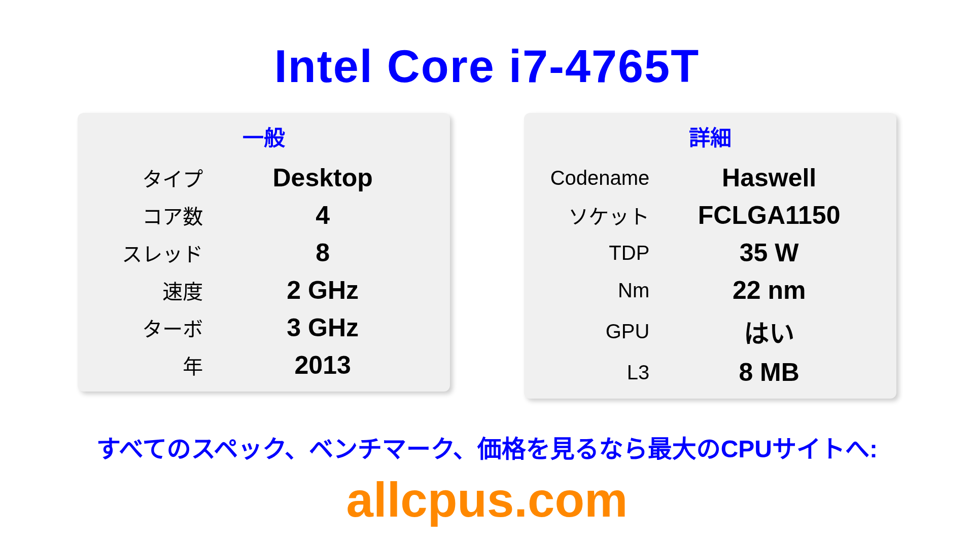 Intel Core i7-4765TはIntelのIntel Coreラインアップのデスクトップ用プロセッサで、Haswellアーキテクチャを基に2013にリリースされました。 このCPUは4コア、基本クロック2000 MHz、最大ターボ周波数3000 MHz、8 MBのL3キャッシュを搭載しています。 22 nmプロセス技術で製造されています。Intel Core i7-4765TはLGA1150ソケット向けに設計されています。 統合Intel® HD Graphics 4600グラフィックスを搭載しています。