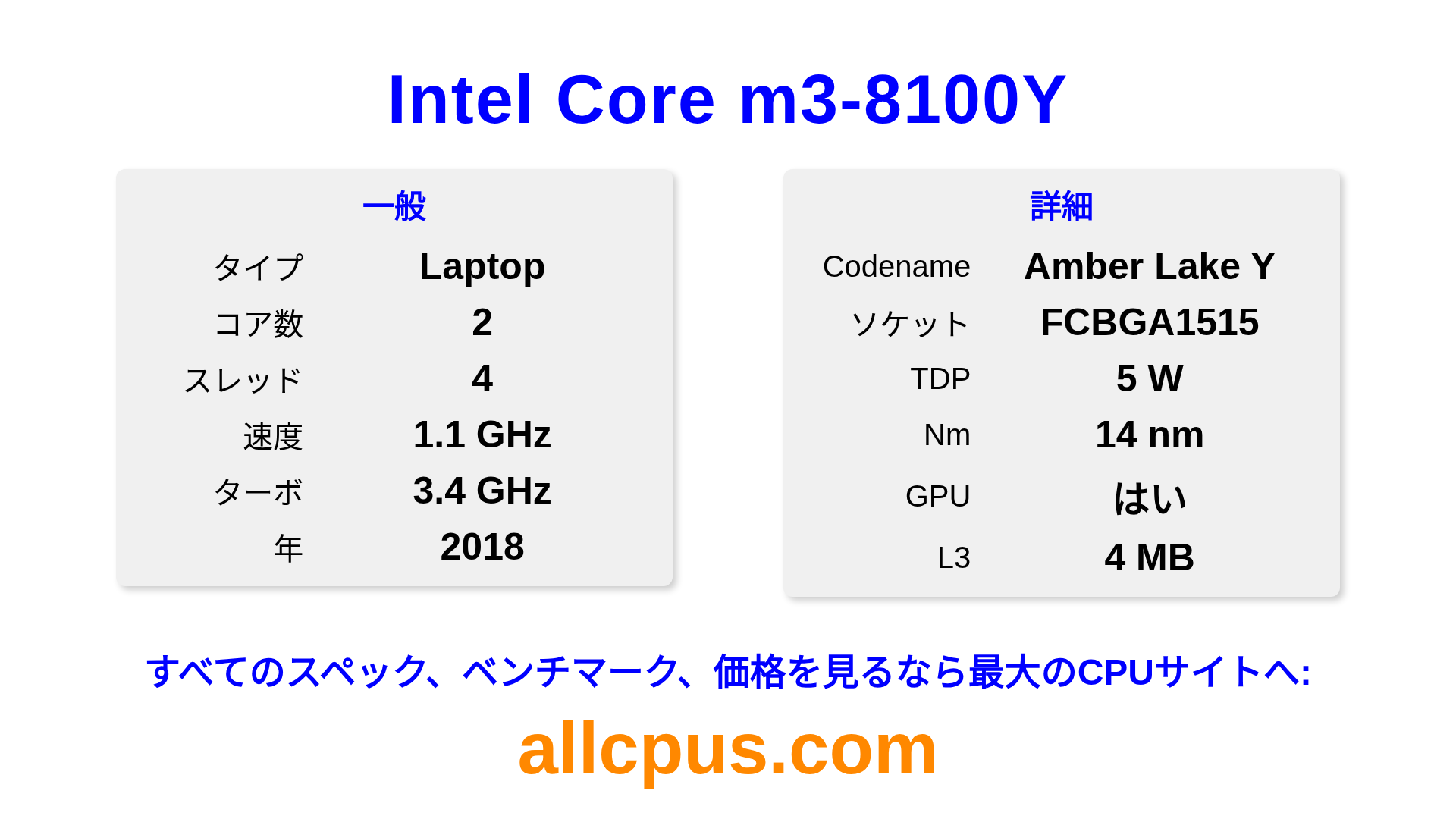 Intel Core m3-8100YはIntelのIntel CoreラインアップのノートPC用プロセッサで、Amber Lake Yアーキテクチャを基に2018にリリースされました。 このCPUは2コア、基本クロック1100 MHz、最大ターボ周波数3400 MHz、4 MBのL3キャッシュを搭載しています。 14 nmプロセス技術で製造されています。Intel Core m3-8100YはBGA1515ソケット向けに設計されています。 統合Intel® UHD Graphics 615グラフィックスを搭載しています。