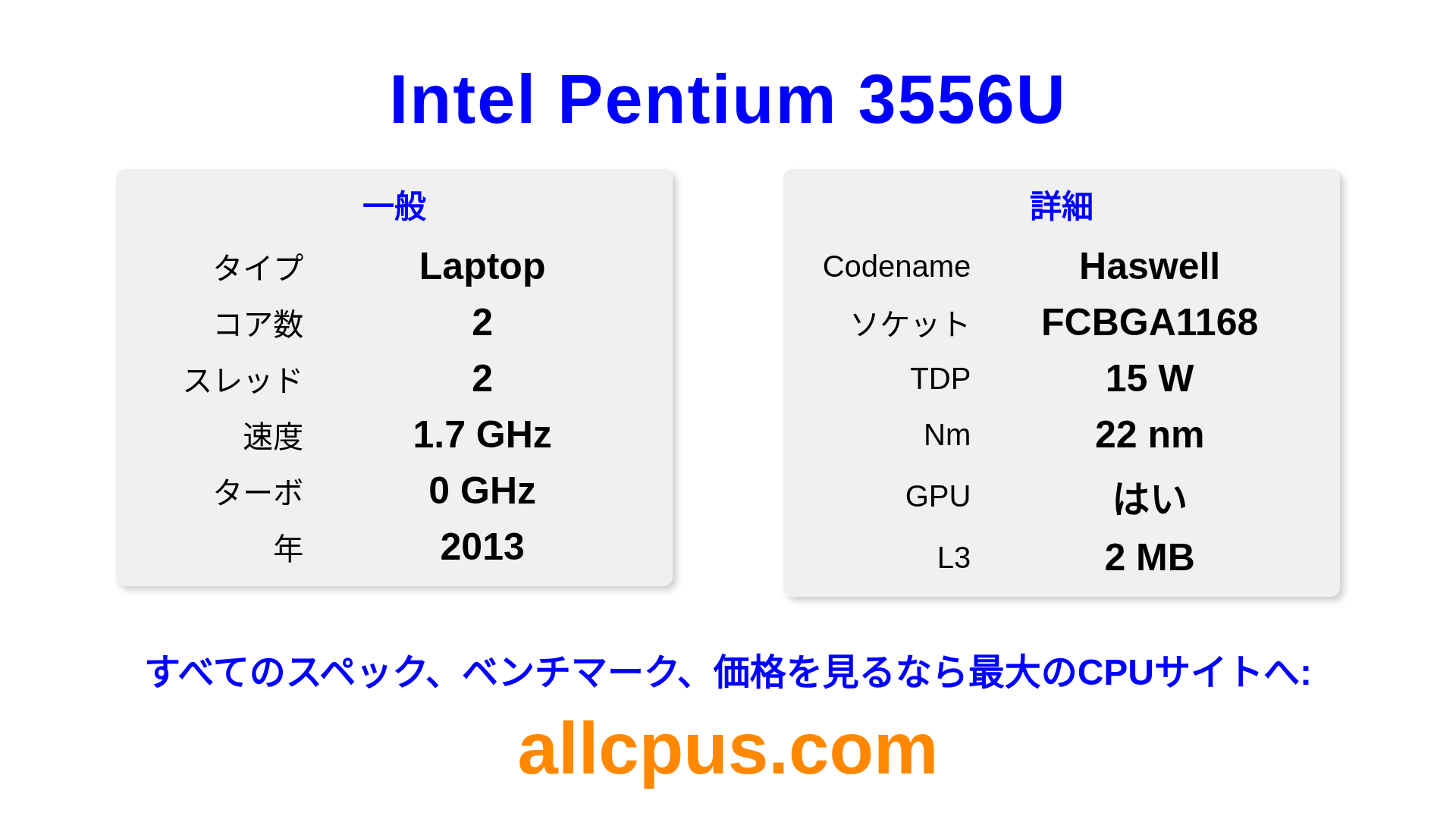 Intel Pentium 3556UはIntelのIntel® Pentium®ラインアップのノートPC用プロセッサで、Haswellアーキテクチャを基に2013にリリースされました。 このCPUは2コア、基本クロック1700 MHz、最大ターボ周波数0 MHz、2 MBのL3キャッシュを搭載しています。 22 nmプロセス技術で製造されています。Intel Pentium 3556UはBGA1168ソケット向けに設計されています。 統合Intel® HD Graphics for 4th Generation Intel® Processorsグラフィックスを搭載しています。