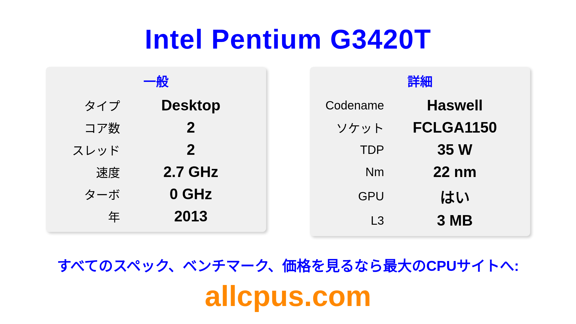 Intel Pentium G3420TはIntelのIntel® Pentium®ラインアップのデスクトップ用プロセッサで、Haswellアーキテクチャを基に2013にリリースされました。 このCPUは2コア、基本クロック2700 MHz、最大ターボ周波数0 MHz、3 MBのL3キャッシュを搭載しています。 22 nmプロセス技術で製造されています。Intel Pentium G3420TはLGA1150ソケット向けに設計されています。 統合Intel® HD Graphics for 4th Generation Intel® Processorsグラフィックスを搭載しています。