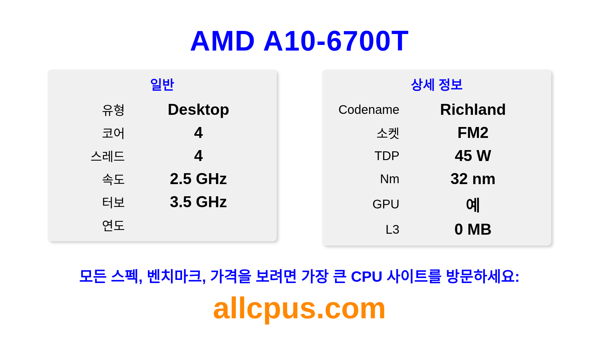 AMD A10-6700T은 A-Series 라인업의 AMD 데스크탑 프로세서이며, Richland 아키텍처 기반으로 년에 출시되었습니다. 이 CPU는 4 코어, 기본 클록 2500 MHz, 최대 터보 주파수 3500 MHz, 0 MB L3 캐시를 특징으로 합니다. 32 nm 공정 기술로 제조됨.AMD A10-6700T은 FM2 소켓용으로 설계되었습니다. 통합 AMD Radeon HD 8650D 그래픽이 포함되어 있습니다.