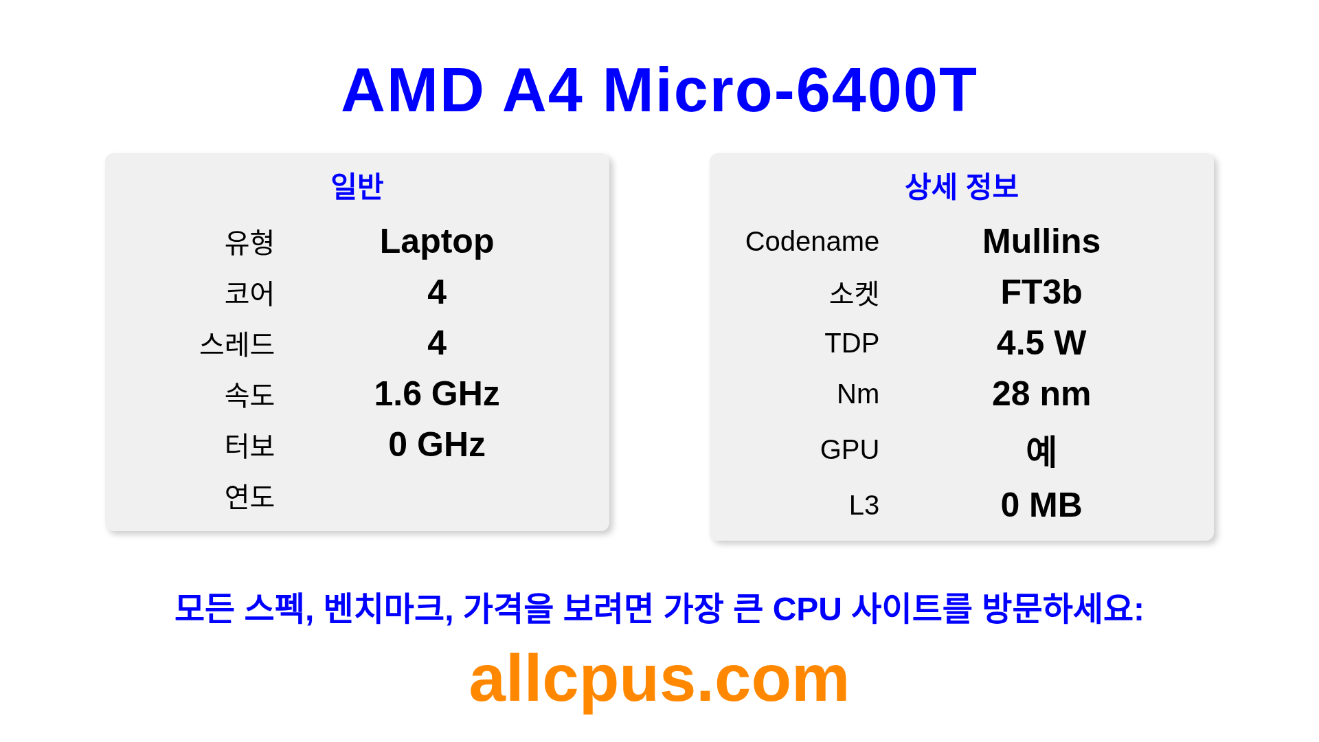 AMD A4 Micro-6400T은 A-Series 라인업의 AMD 노트북 프로세서이며, Mullins 아키텍처 기반으로 년에 출시되었습니다. 이 CPU는 4 코어, 기본 클록 1600 MHz, 최대 터보 주파수 0 MHz, 0 MB L3 캐시를 특징으로 합니다. 28 nm 공정 기술로 제조됨.AMD A4 Micro-6400T은 FT3b 소켓용으로 설계되었습니다. 통합 AMD Radeon R3 Graphics 그래픽이 포함되어 있습니다.
