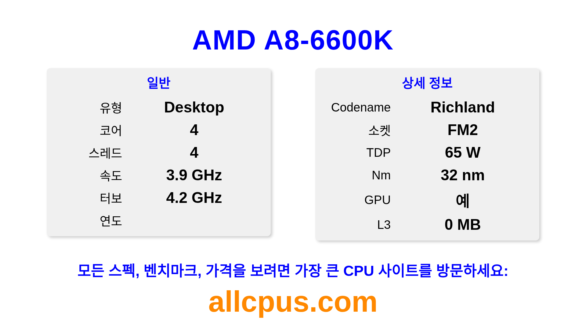 AMD A8-6600K은 A-Series 라인업의 AMD 데스크탑 프로세서이며, Richland 아키텍처 기반으로 년에 출시되었습니다. 이 CPU는 4 코어, 기본 클록 3900 MHz, 최대 터보 주파수 4200 MHz, 0 MB L3 캐시를 특징으로 합니다. 32 nm 공정 기술로 제조됨.AMD A8-6600K은 FM2 소켓용으로 설계되었습니다.오버클럭을 지원합니다. 통합 AMD Radeon HD 8570D 그래픽이 포함되어 있습니다.