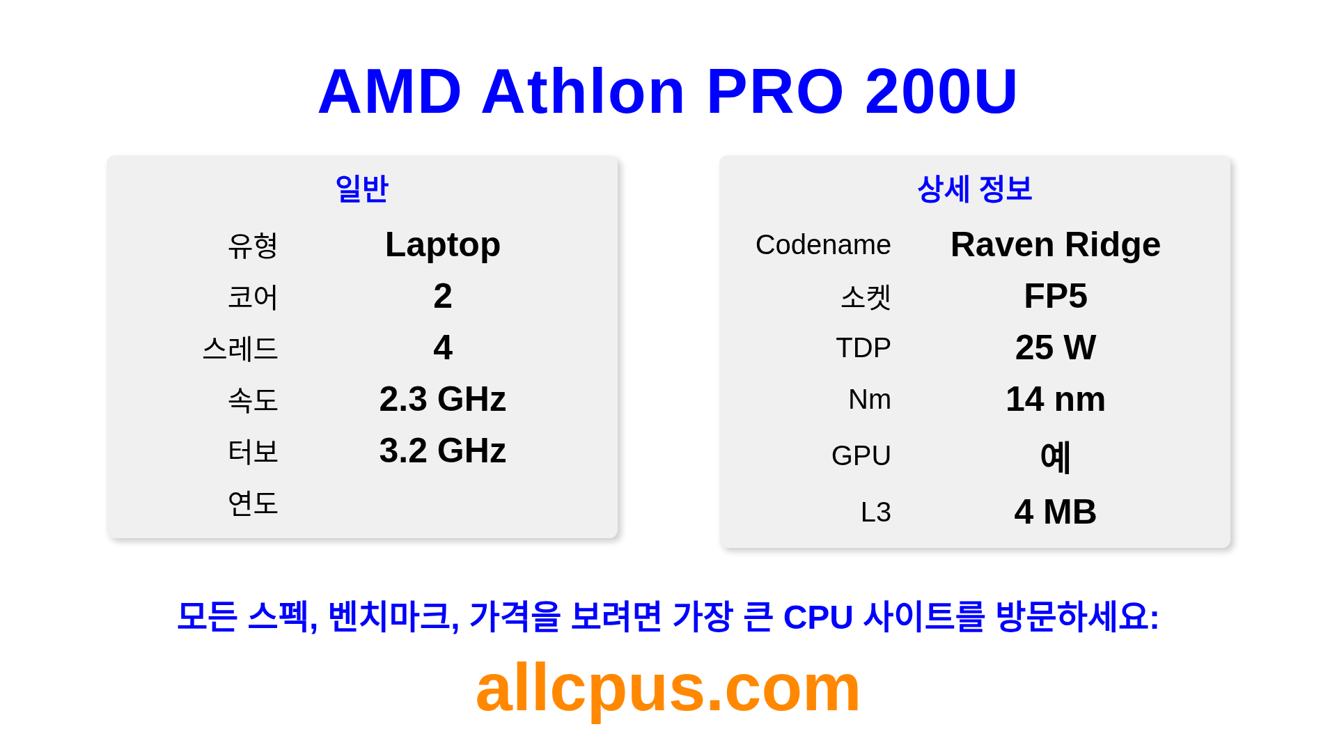 AMD Athlon PRO 200U은 Athlon PRO 라인업의 AMD 노트북 프로세서이며, Raven Ridge 아키텍처 기반으로 년에 출시되었습니다. 이 CPU는 2 코어, 기본 클록 2300 MHz, 최대 터보 주파수 3200 MHz, 4 MB L3 캐시를 특징으로 합니다. 14 nm 공정 기술로 제조됨.AMD Athlon PRO 200U은 FP5 소켓용으로 설계되었습니다. 통합 Radeon Vega 3 Graphics 그래픽이 포함되어 있습니다.