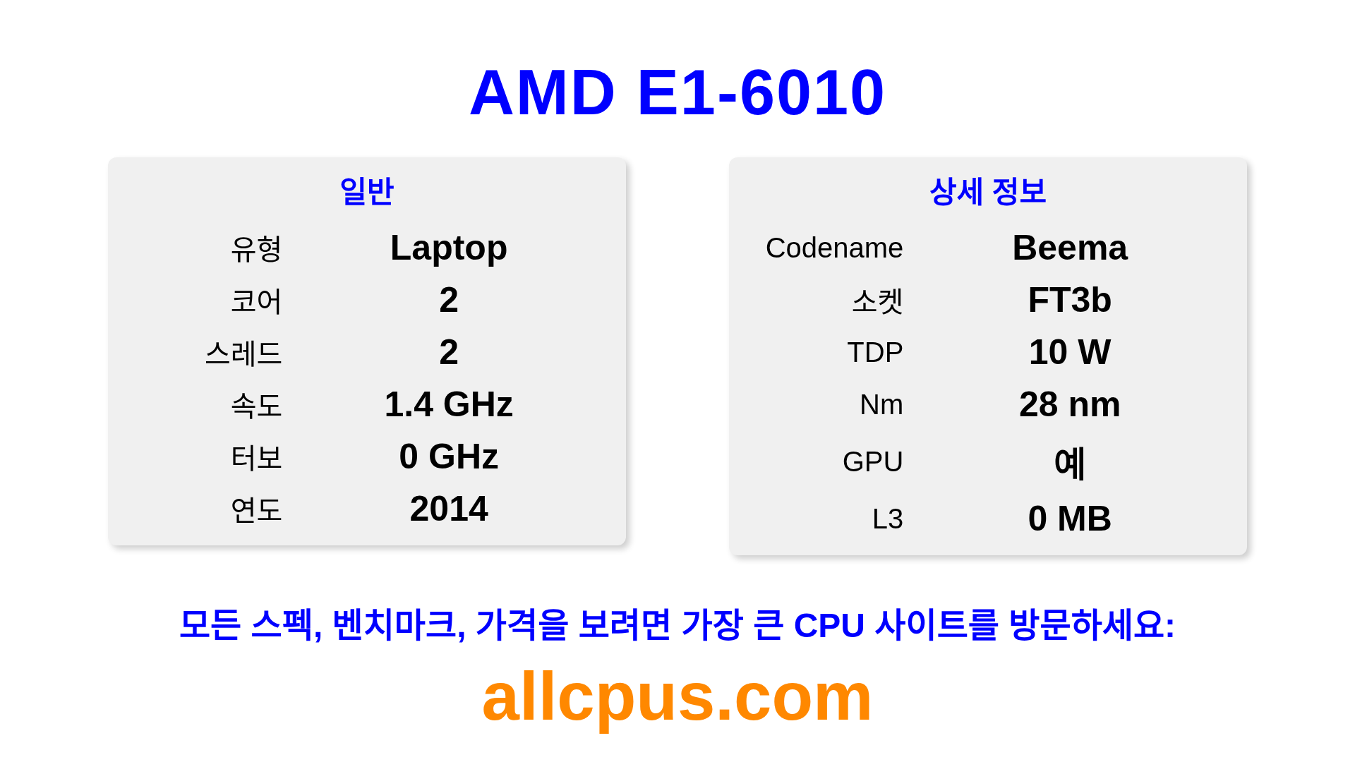 AMD E1-6010은 E-Series 라인업의 AMD 노트북 프로세서이며, Beema 아키텍처 기반으로 2014년에 출시되었습니다. 이 CPU는 2 코어, 기본 클록 1350 MHz, 최대 터보 주파수 0 MHz, 0 MB L3 캐시를 특징으로 합니다. 28 nm 공정 기술로 제조됨.AMD E1-6010은 FT3b 소켓용으로 설계되었습니다. 통합 AMD Radeon R2 Graphics 그래픽이 포함되어 있습니다.