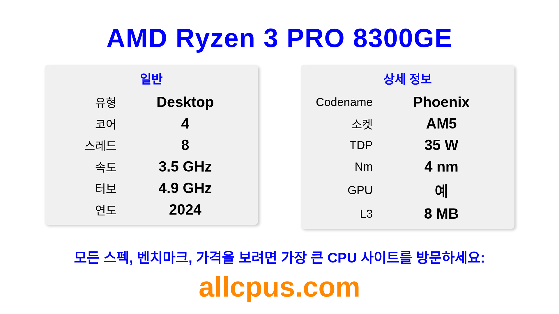 AMD Ryzen 3 PRO 8300GE은 Ryzen PRO 라인업의 AMD 데스크탑 프로세서이며, Phoenix 아키텍처 기반으로 2024년에 출시되었습니다. 이 CPU는 4 코어, 기본 클록 3500 MHz, 최대 터보 주파수 4900 MHz, 8 MB L3 캐시를 특징으로 합니다. 4 nm 공정 기술로 제조됨.AMD Ryzen 3 PRO 8300GE은 AM5 소켓용으로 설계되었습니다.오버클럭을 지원합니다. 통합 AMD Radeon 740M 그래픽이 포함되어 있습니다.