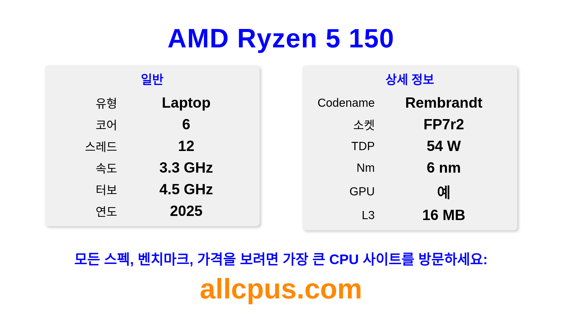 AMD Ryzen 5 150은 Ryzen 라인업의 AMD 노트북 프로세서이며, Rembrandt 아키텍처 기반으로 2025년에 출시되었습니다. 이 CPU는 6 코어, 기본 클록 3300 MHz, 최대 터보 주파수 4550 MHz, 16 MB L3 캐시를 특징으로 합니다. 6 nm 공정 기술로 제조됨.AMD Ryzen 5 150은 FP7r2 소켓용으로 설계되었습니다. 통합 AMD Radeon 660M 그래픽이 포함되어 있습니다.