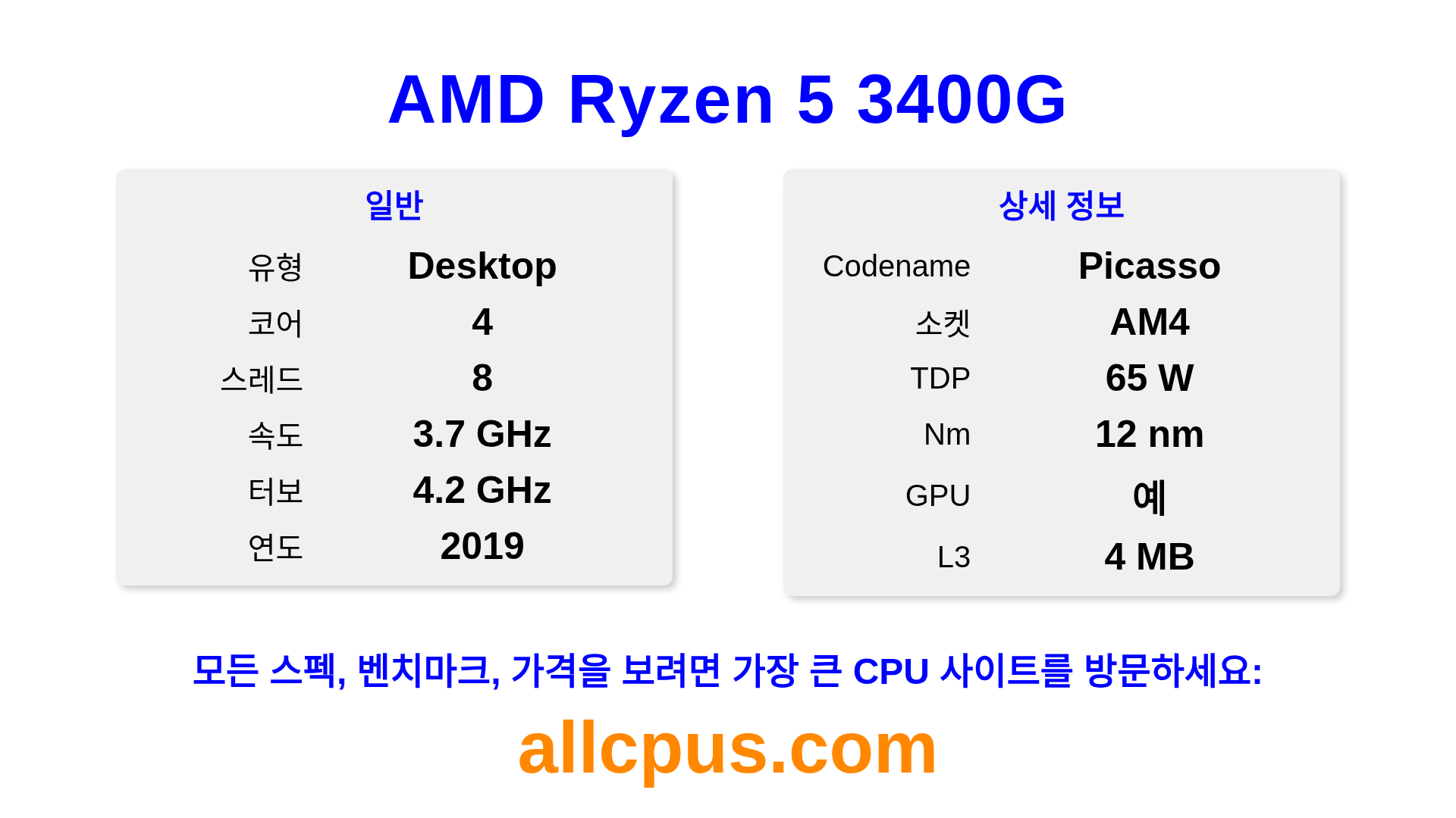 AMD Ryzen 5 3400G은 Ryzen 라인업의 AMD 데스크탑 프로세서이며, Picasso 아키텍처 기반으로 2019년에 출시되었습니다. 이 CPU는 4 코어, 기본 클록 3700 MHz, 최대 터보 주파수 4200 MHz, 4 MB L3 캐시를 특징으로 합니다. 12 nm 공정 기술로 제조됨.AMD Ryzen 5 3400G은 AM4 소켓용으로 설계되었습니다.오버클럭을 지원합니다. 통합 Radeon RX Vega 11 Graphics 그래픽이 포함되어 있습니다.