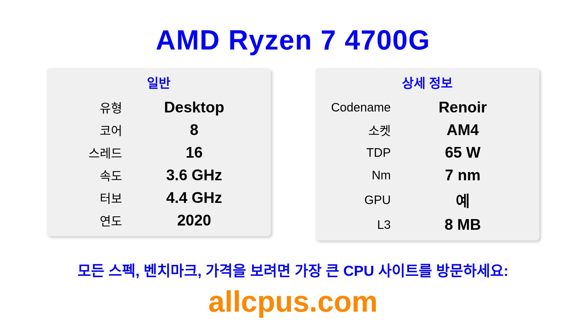AMD Ryzen 7 4700G은 Ryzen 라인업의 AMD 데스크탑 프로세서이며, Renoir 아키텍처 기반으로 2020년에 출시되었습니다. 이 CPU는 8 코어, 기본 클록 3600 MHz, 최대 터보 주파수 4400 MHz, 8 MB L3 캐시를 특징으로 합니다. 7 nm 공정 기술로 제조됨.AMD Ryzen 7 4700G은 AM4 소켓용으로 설계되었습니다.오버클럭을 지원합니다. 통합 Radeon Graphics 그래픽이 포함되어 있습니다.