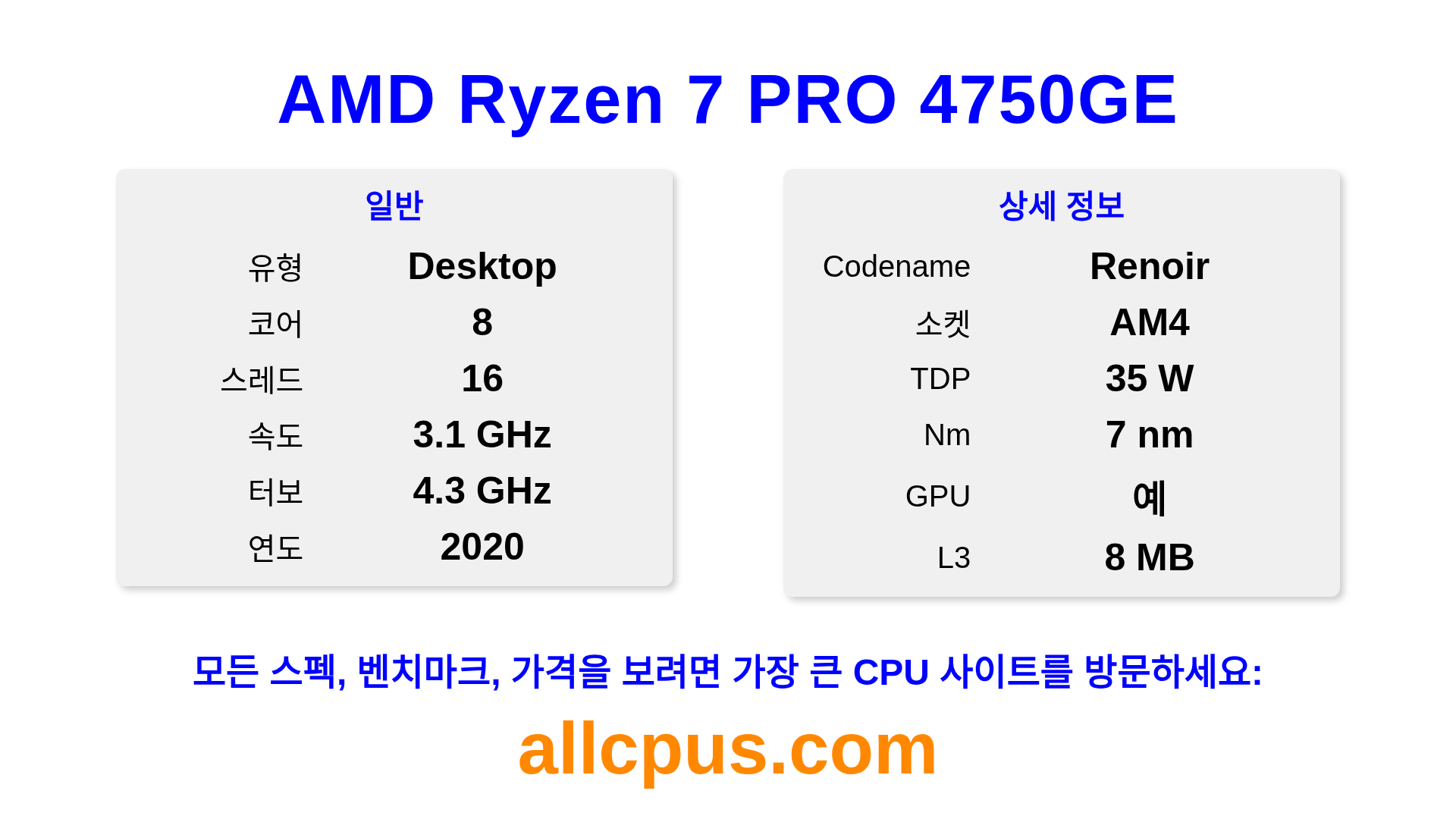 AMD Ryzen 7 PRO 4750GE은 Ryzen PRO 라인업의 AMD 데스크탑 프로세서이며, Renoir 아키텍처 기반으로 2020년에 출시되었습니다. 이 CPU는 8 코어, 기본 클록 3100 MHz, 최대 터보 주파수 4300 MHz, 8 MB L3 캐시를 특징으로 합니다. 7 nm 공정 기술로 제조됨.AMD Ryzen 7 PRO 4750GE은 AM4 소켓용으로 설계되었습니다. 통합 Radeon Graphics 그래픽이 포함되어 있습니다.