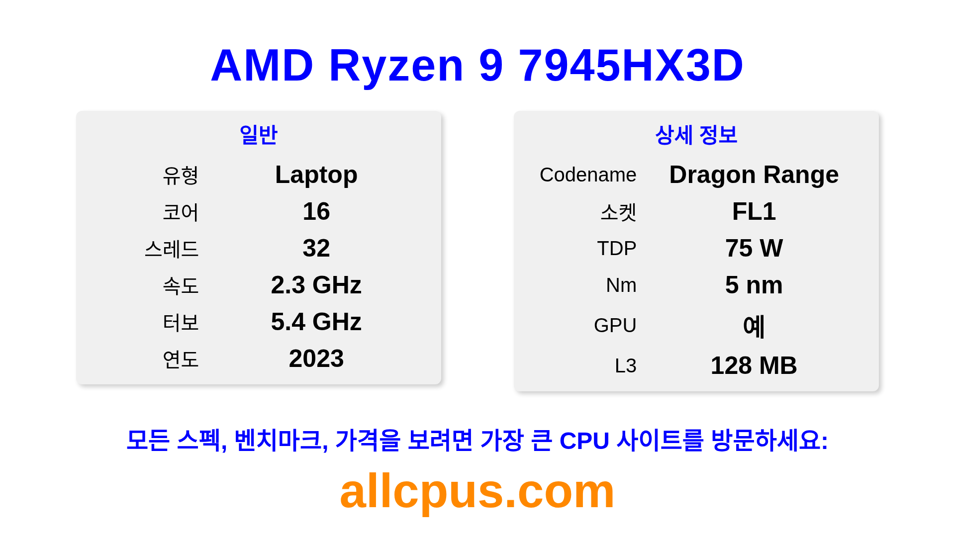 AMD Ryzen 9 7945HX3D은 Ryzen 라인업의 AMD 노트북 프로세서이며, Dragon Range 아키텍처 기반으로 2023년에 출시되었습니다. 이 CPU는 16 코어, 기본 클록 2300 MHz, 최대 터보 주파수 5400 MHz, 128 MB L3 캐시를 특징으로 합니다. 5 nm 공정 기술로 제조됨.AMD Ryzen 9 7945HX3D은 FL1 소켓용으로 설계되었습니다.오버클럭을 지원합니다. 통합 AMD Radeon 610M 그래픽이 포함되어 있습니다.