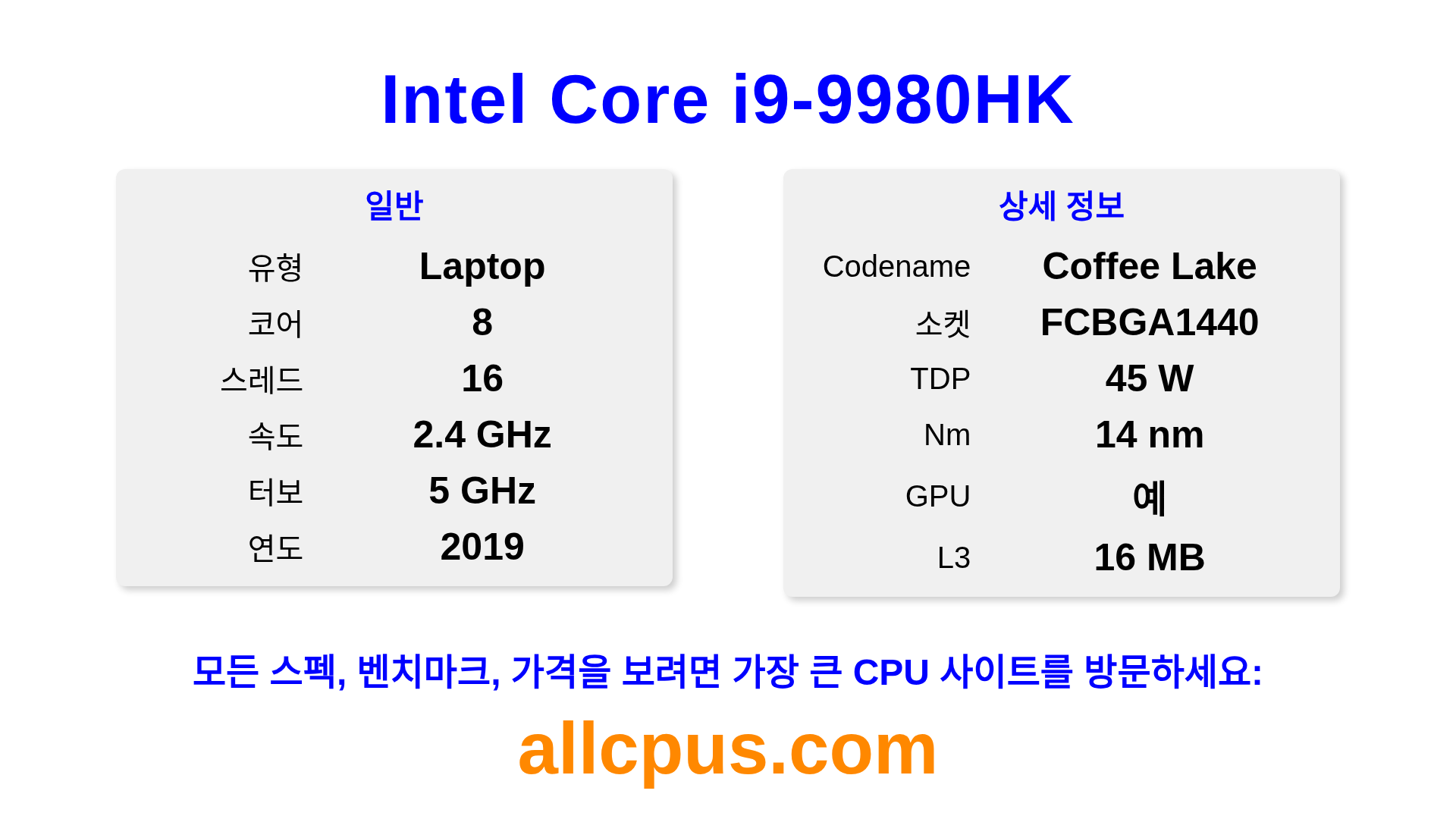 Intel Core i9-9980HK은 Intel Core 라인업의 Intel 노트북 프로세서이며, Coffee Lake 아키텍처 기반으로 2019년에 출시되었습니다. 이 CPU는 8 코어, 기본 클록 2400 MHz, 최대 터보 주파수 5000 MHz, 16 MB L3 캐시를 특징으로 합니다. 14 nm 공정 기술로 제조됨.Intel Core i9-9980HK은 BGA1440 소켓용으로 설계되었습니다.오버클럭을 지원합니다. 통합 Intel® UHD Graphics 630 그래픽이 포함되어 있습니다.