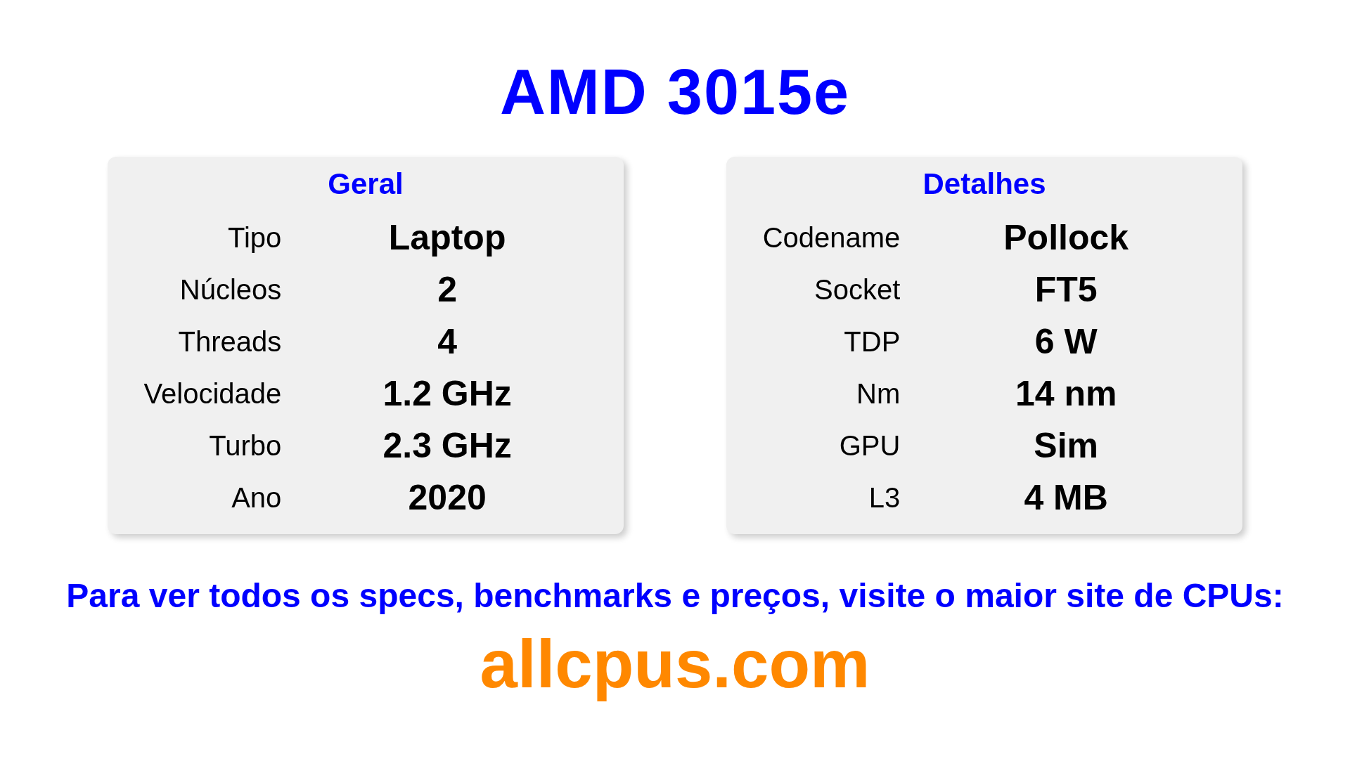 O AMD 3015e é um AMD processador de notebook da linha AMD, baseado na arquitetura Pollock e lançado em 2020. Este CPU possui 2 núcleos, clock base de 1200 MHz, frequência turbo máxima de 2300 MHz e 4 MB de cache L3. Fabricado usando tecnologia de processo de 14 nm.O AMD 3015e é projetado para o socket FT5. Inclui gráficos integrados AMD Radeon Graphics.
